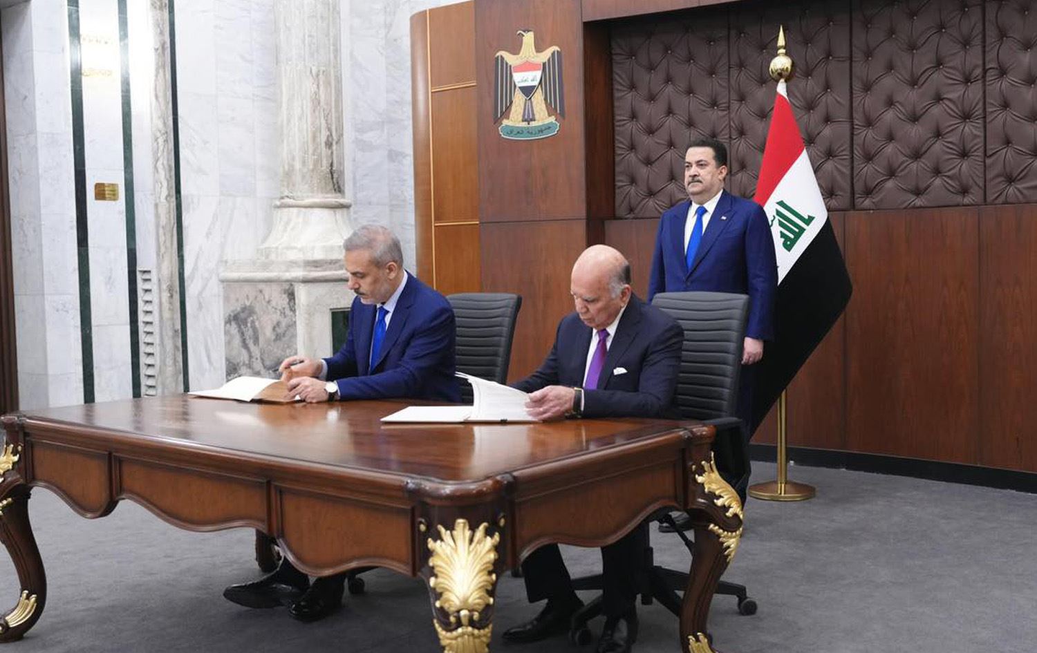 وەزیری دەرەوەی عێراق و تورکیا رێککەوتنەکە واژۆ دەکەن و سەرۆکوەزیرانی عێراق لەدواوەیان وەستاوە.