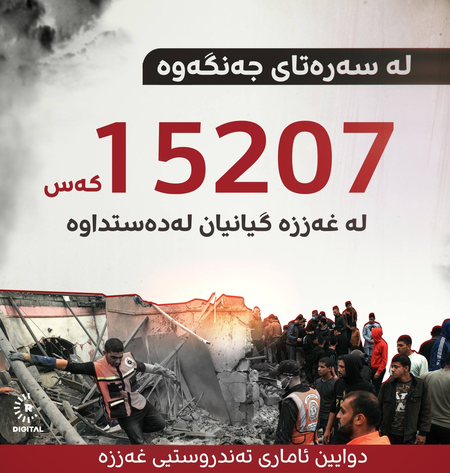 57 رۆژە جەنگی نێوان بزووتنەوەی حەماس و ئیسرائیل بەردەوامە، تاوەکو ئێستا بەهۆی جەنگەوە لە غەززە 15 هەزار و 207 کەس گیانیان لەدەستداوە، بەگوێرەی بەرپرسانی غەززە، "زۆرینەی ئەوانەی بەهۆی بۆردوومانەکانەوە گیانیان لەدەستداوە ژن و منداڵن." ئیسرائیلیش دەڵێت، لە رۆژی 7ـی ئۆکتۆبەرەوە تاوەکو ئێستا 1200 ئیسرئیلی گیانیان لەدەستداوە.