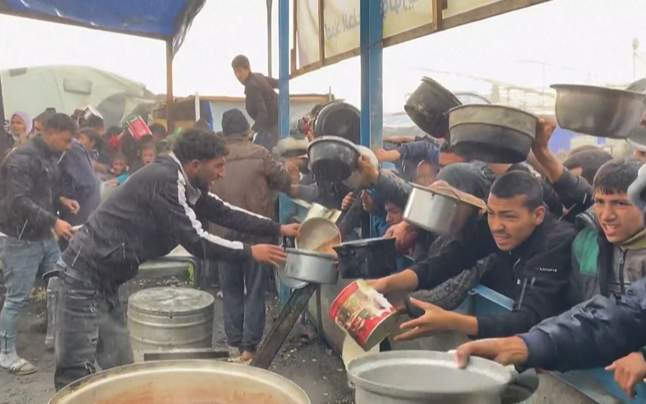 لە نێوەندێکی دابەشکردنی خۆراک لە شاری خان یونسی کەرتی غەززە، گەورە و بچووک، لەبەر باران بە مەنجەڵێکەوە نۆرە بۆ وەرگرتنی خۆراک دەگرن. بەگوێرەی رێکخراوە نێودەوڵەتییەکان 22٪ـی دانیشتووانی کەرتی غەززە لە ئاستێکی کارەساتباری ئاسایشی خۆراکدان.