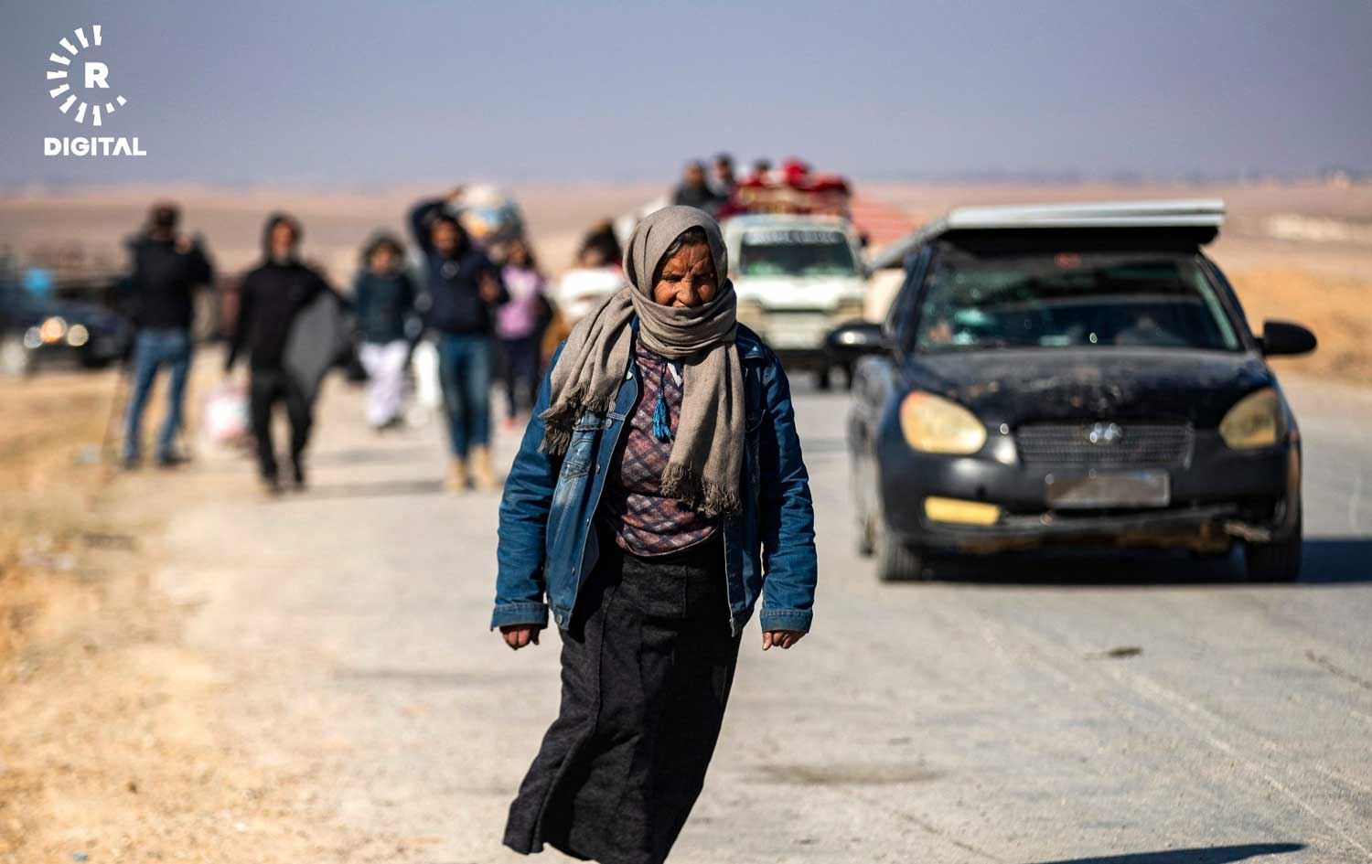 ئاوارەبوونی دانیشتووانی عەفرین لە شەهباوە بۆ تەبقە بەهۆی هێرشی گرووپە چەکدارەکانەوە؛ وێنە: رووداو