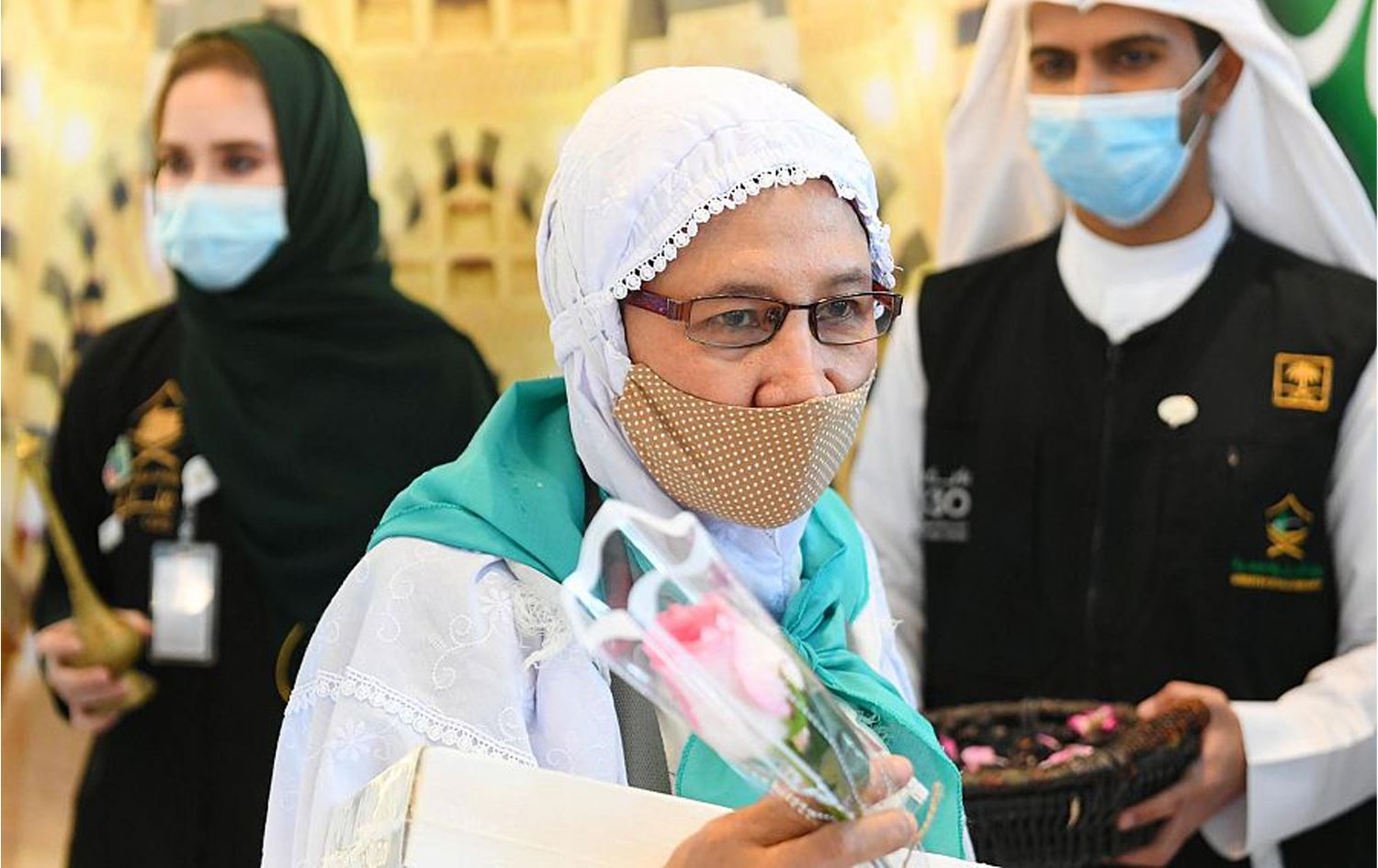 کاتێک زیارەتکاران گەیشتنە فڕۆکەخانەی ئەمیر محەممەد بن عەبدولعەزیز بە گوڵ، خورما و ئاوی زەم زەم پێشوازییان لێکرا.