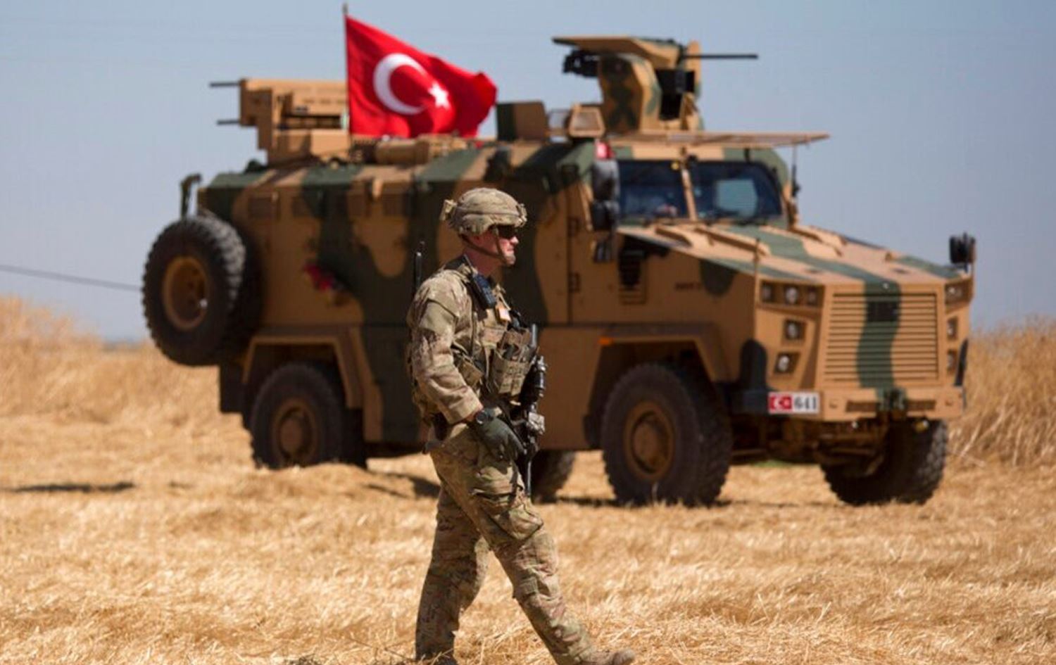 ئۆتۆمبێلێکی سەربازیی تورکیا لە پشت سەربازێکی هاوپەیمانانەوە دەردەکەوێت لە رۆژئاوای کوردستان. وێنە:AP