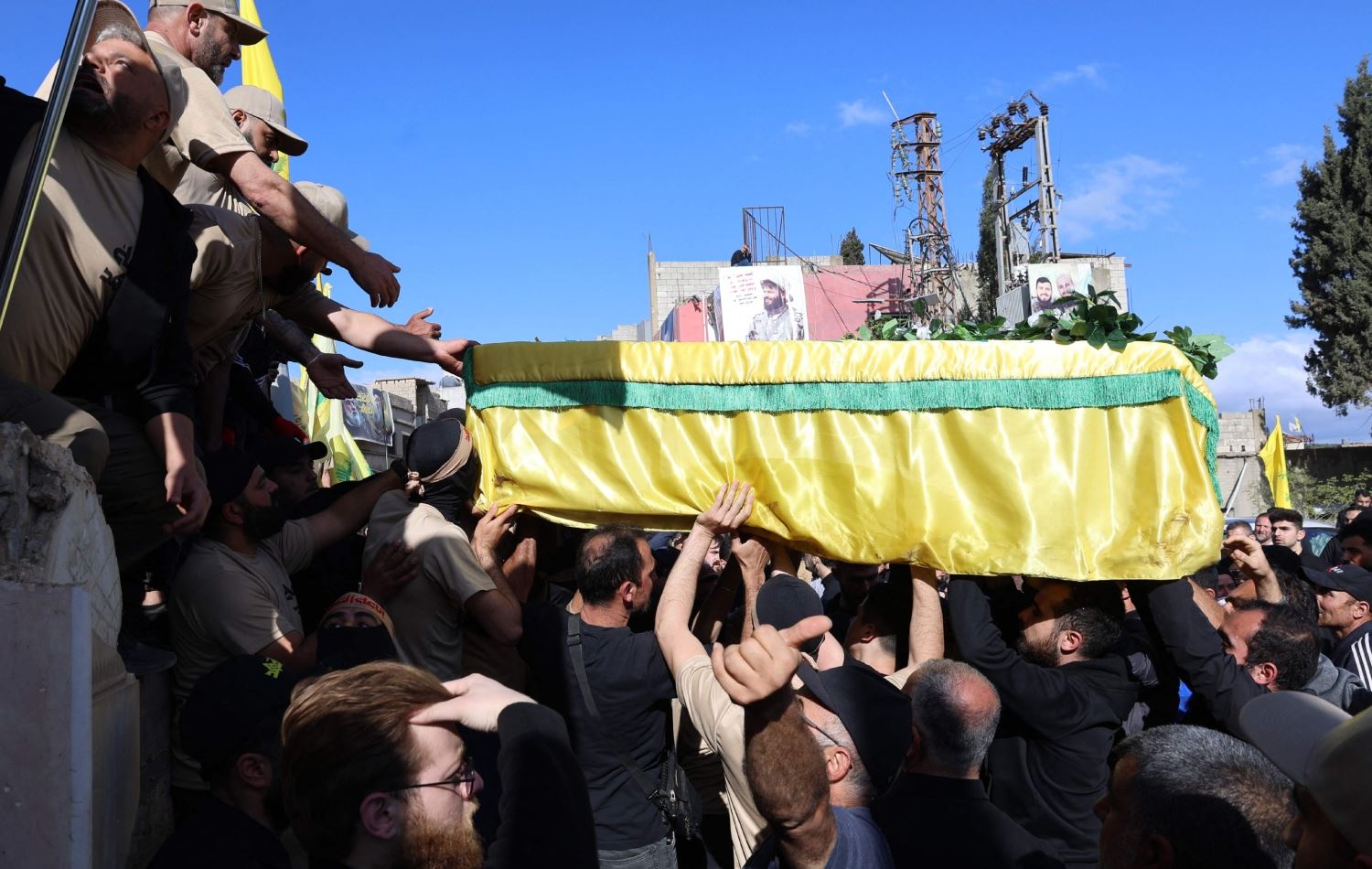 رێوڕەسمی ناشتنی تەرمی چەند چەکدارێکی حیزبوڵڵا لە گوندێکی باشووری لوبنان لە 4-4-2025، وێنە: Rabih DAHER / AFP