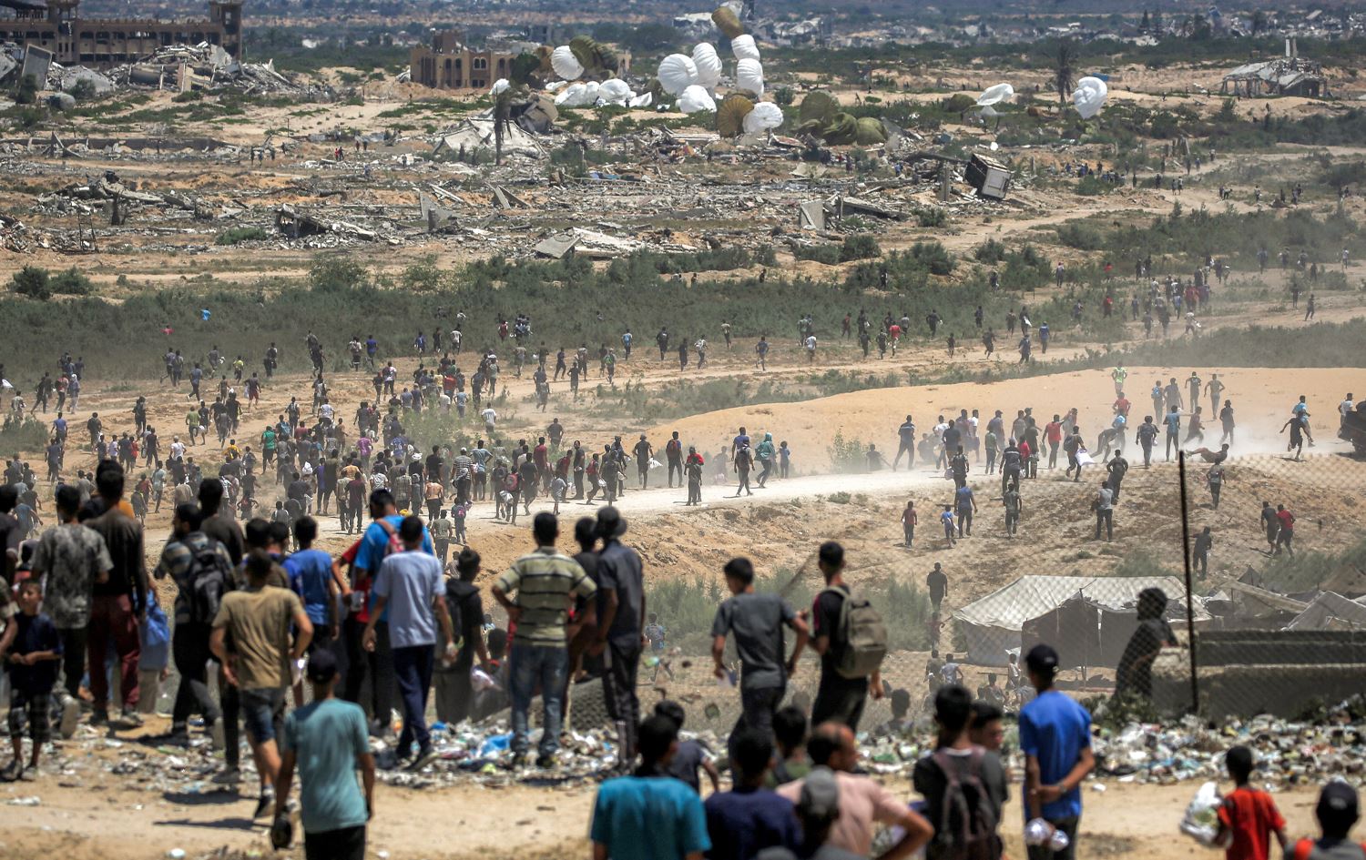 چەند پاکێجێکی خۆراک بەردراونەتەوە و گەورە و بچووکی کەرتەکە رادەکەن بۆ وەرگرتنی. وێنە: AFP