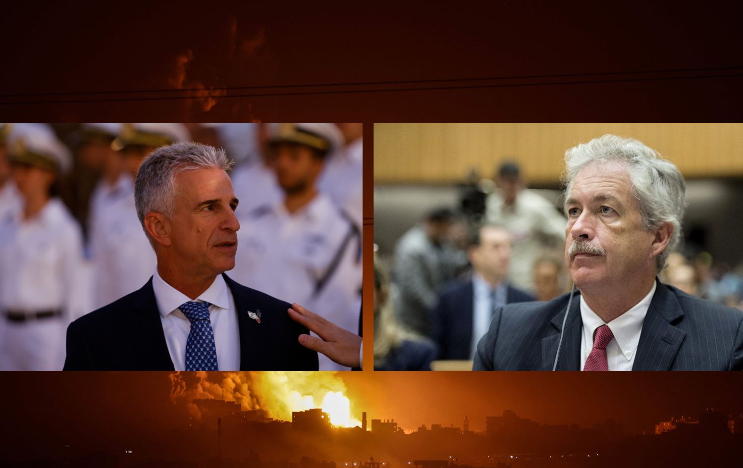 ویلیەم بێرنز، بەڕێوەبەری گشتیی CIA و دەیڤد بارنی، سەرۆکی مۆسادی ئیسرائیل. وێنەی پشتەوەیان کەرتی غەززەیە.