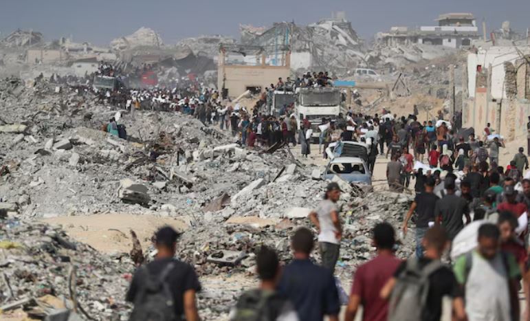فەڵەستینییەکان کەلوپەلی یارمەتیی هەڵدەگرنەوە، لە بەیت لاهیا لە باکووری کەرتی غەززە، 2ی ئابی 2025. وێنە: Reuters