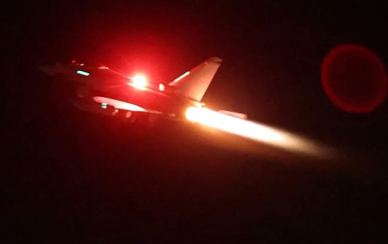 فڕۆکەی جەنگیی تایفۆنی بەریتانی لەکاتی هێرش بۆ سەر حووسییەکان. وێنە: وەزارەتی بەرگریی بەریتانیا