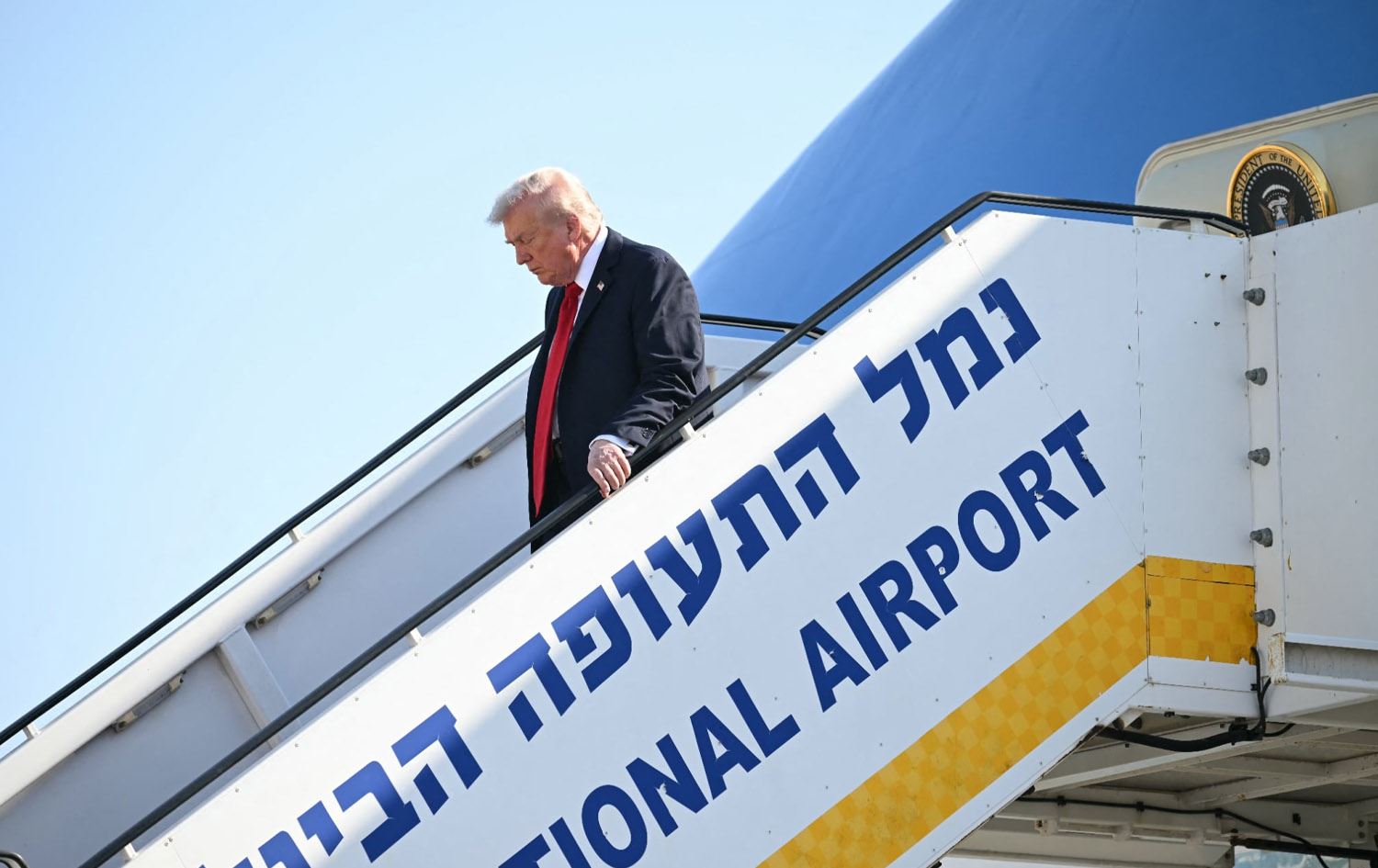 فڕۆکەکەی ترەمپ لە فڕۆکەخانەی بنگۆریۆن لە تەلئەڤیڤ نیشتەوە و لەوێ لە لایەن بنیامین نەتەنیاهوو، سەرۆکوەزیران؛ ئیسحاق هێرتزۆگ، سەرۆکی ئیسرائیل و بەرپرسانی باڵای دیکەوە پێشوازی لێکرا.