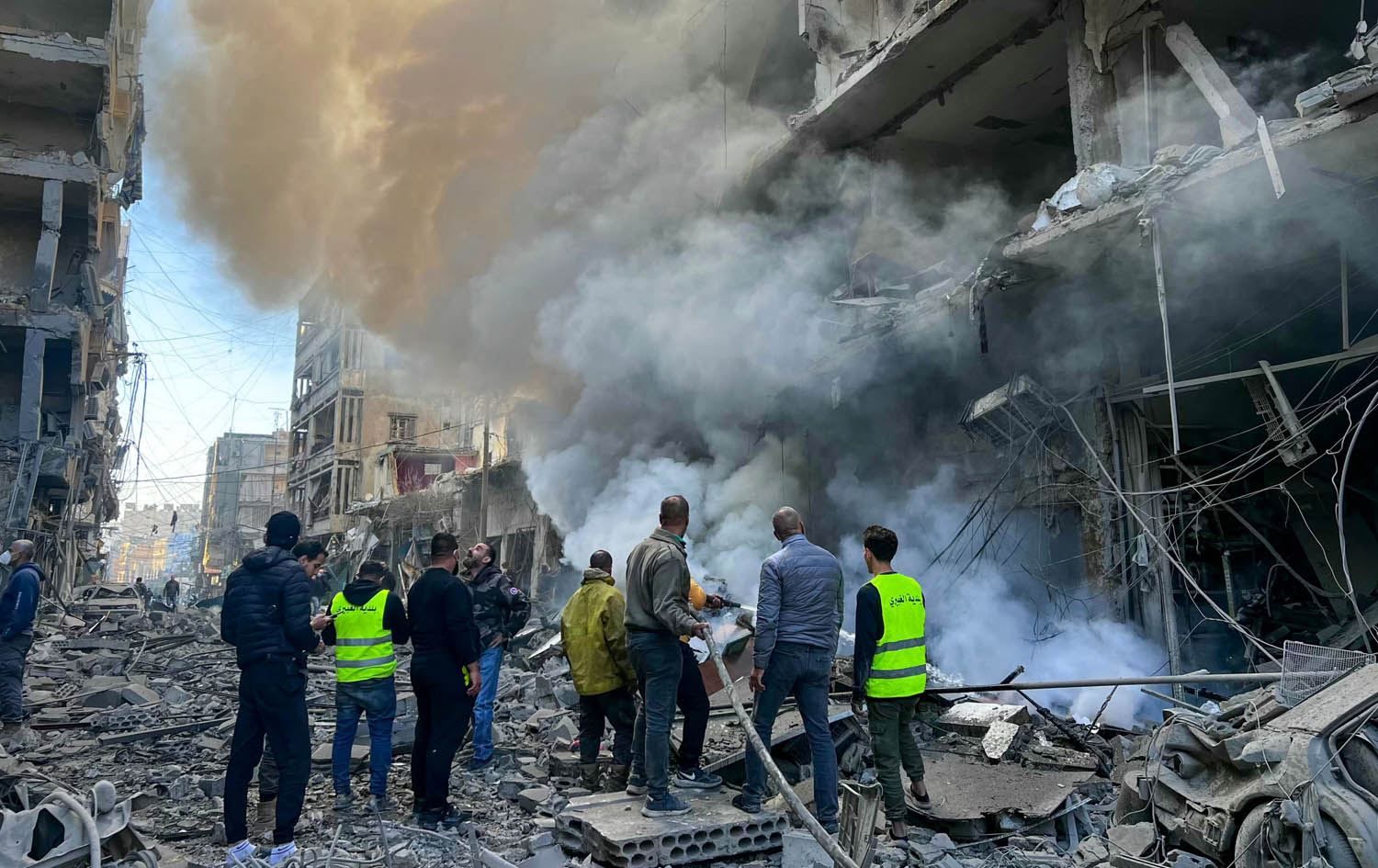 تیمێکی ئاگرکوژێنەوە لە بەیرووت، دوای بۆردوومانێکی سوپای ئیسرائیل، ئاگری باڵەخانەیەک دەکوژێننەوە. وێنە: AFP