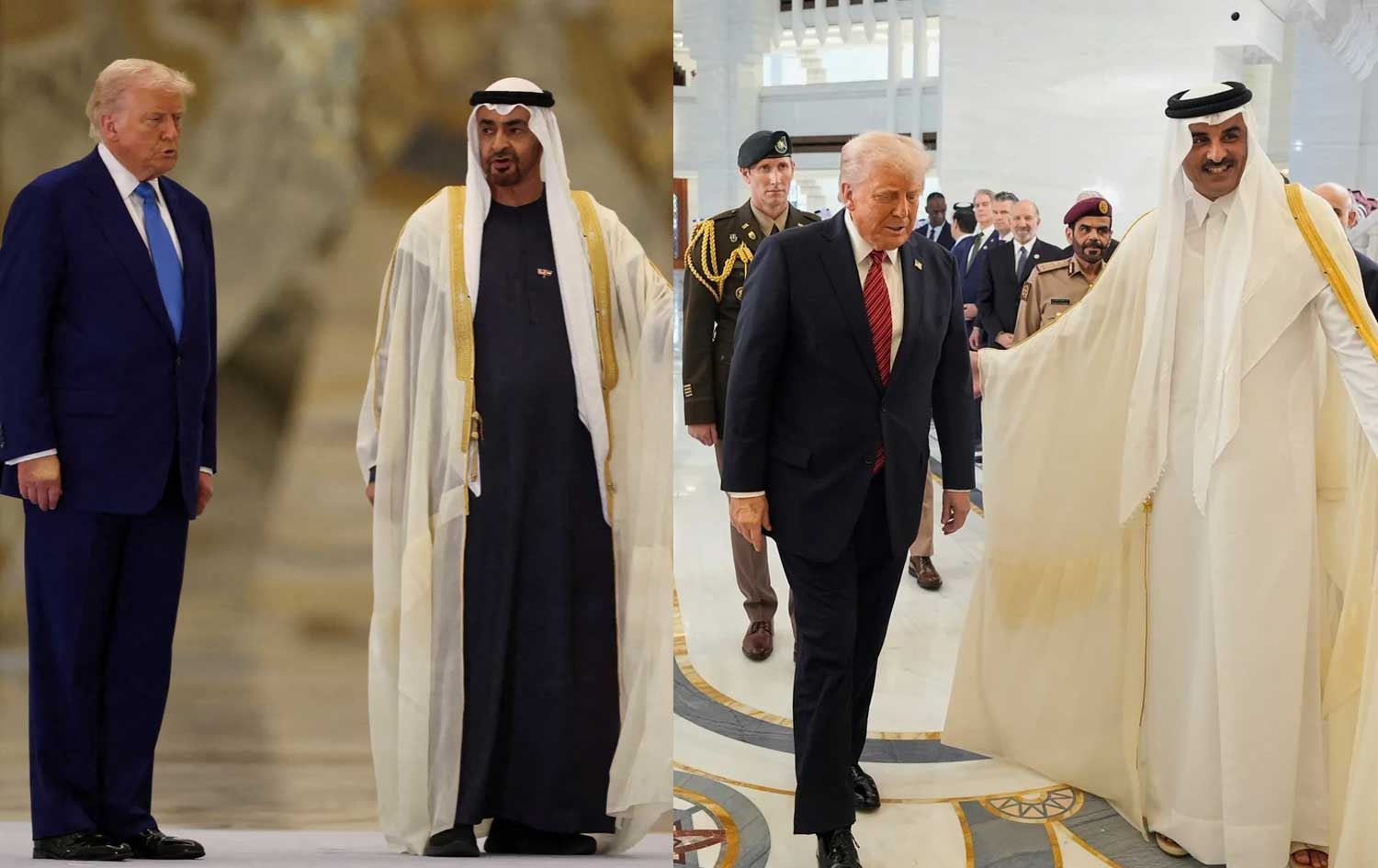 محەممەد بن زاید ئال نەهیان، سەرۆکی ئیمارات لە ئەبو زەبی پێشوازی لە ترەمپ کرد. کۆمەڵێک کچی گەنج بە بادانی قژ و سەمای نەریتیی کچانی کەنداو و عەبای سپییەوە پێشوازییان لە سەرۆکی ئەمریکا کرد. ترەمپ پێش هەموو شوێنێک سەردانی مزگەوتی گەورەی شێخ زایدی کرد و بەبێ پێڵاو چووە نێو حەرەمی (نوور).