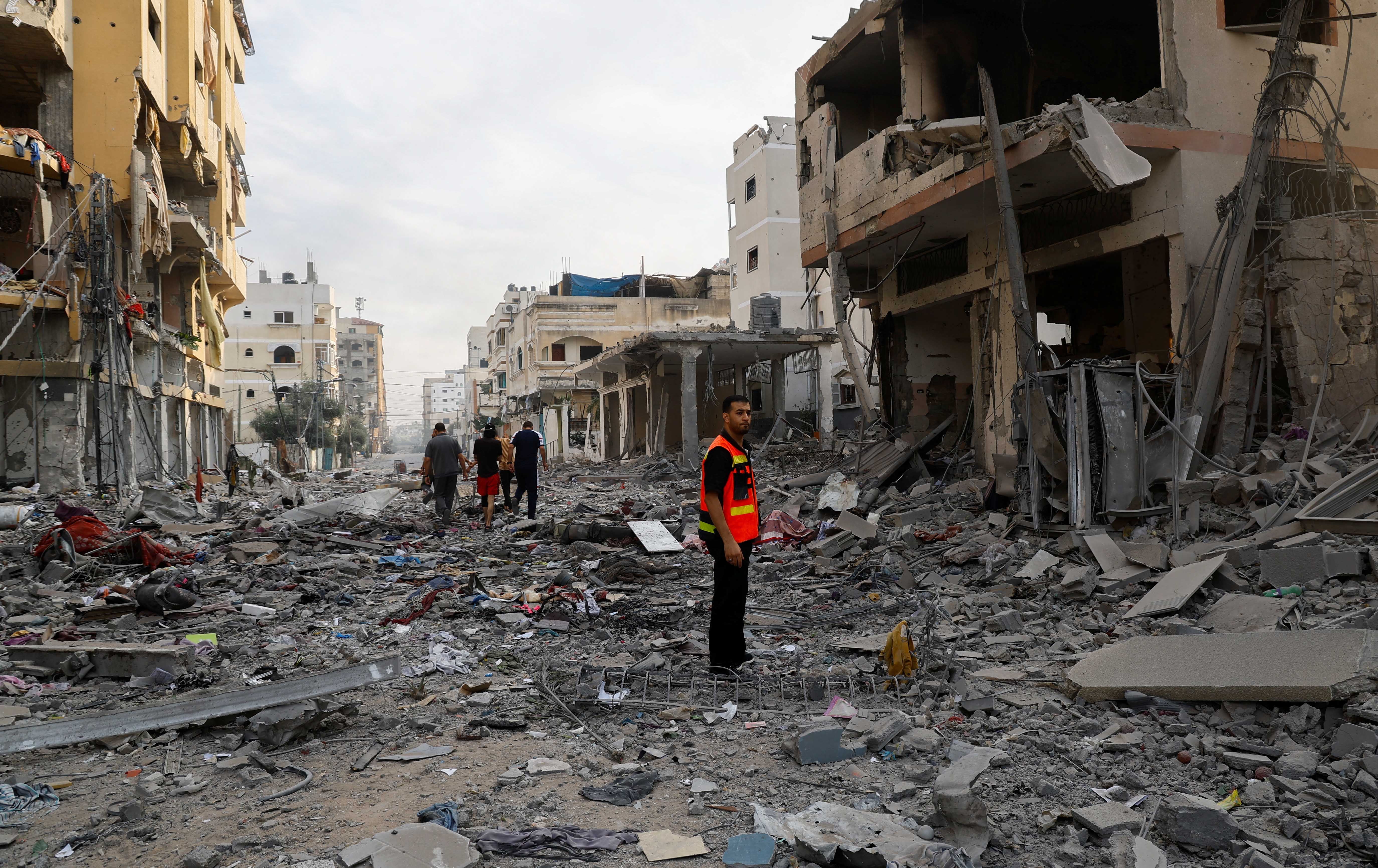 کارمەندێکی رێکخراوەکانی فریاگوزاری لەنێو داروپەردووی رووخاوی غەززەدا. وێنە: Reuters