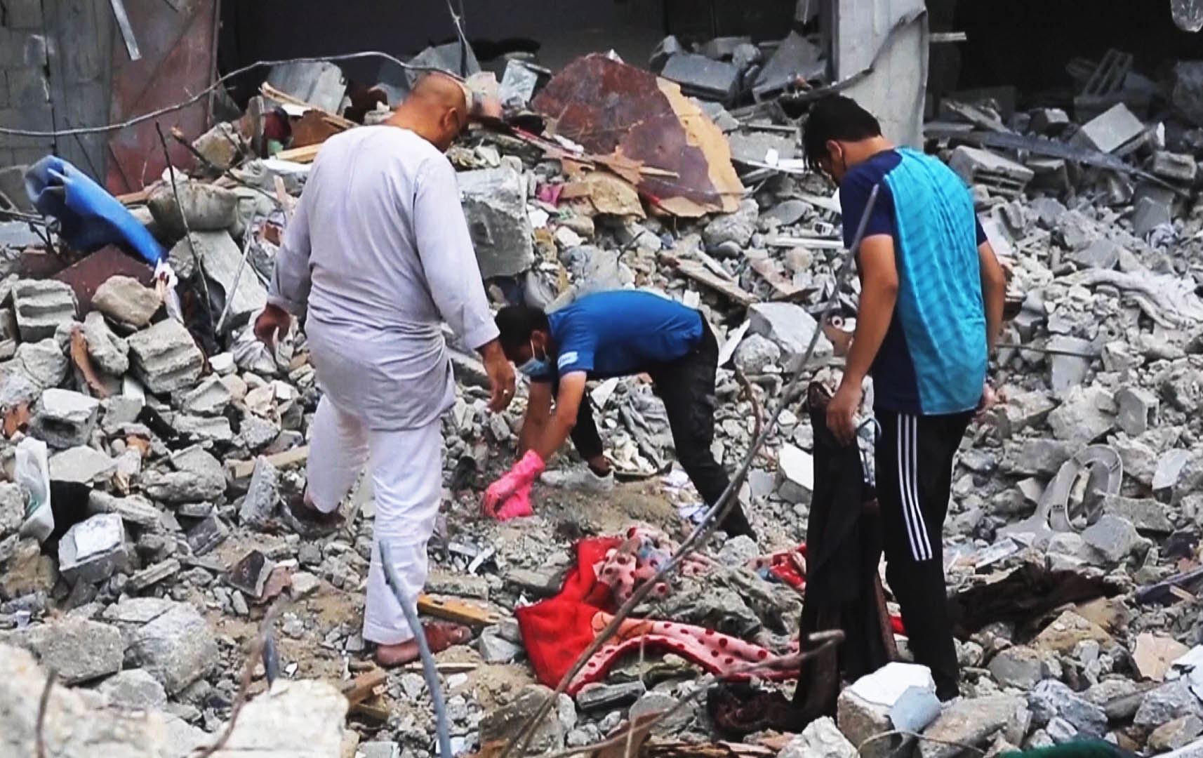 دوای ئەوەی نێوەڕاستی کەرتی غەززە لەلایەن سوپای ئیسرائیلەوە بۆردوومان کراوە، هاووڵاتییان و هێزەکانی بەرگریی شارستانی لە ژێر دارووپەردووی خانووە رووخاوەکاندا تەرمەکان دەردەهێنن.
