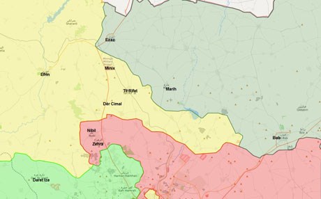 بۆیە تورکیا (بەپێی نەخشەکە) لە هەوڵی ئەوەدایە ئیعزاز لەگەڵ هەرسێ شارۆچکەکە پێکەوە ببەستێتەوە و بەشێوەیەکی بازنەیی عفرین گەمارۆ بدات.