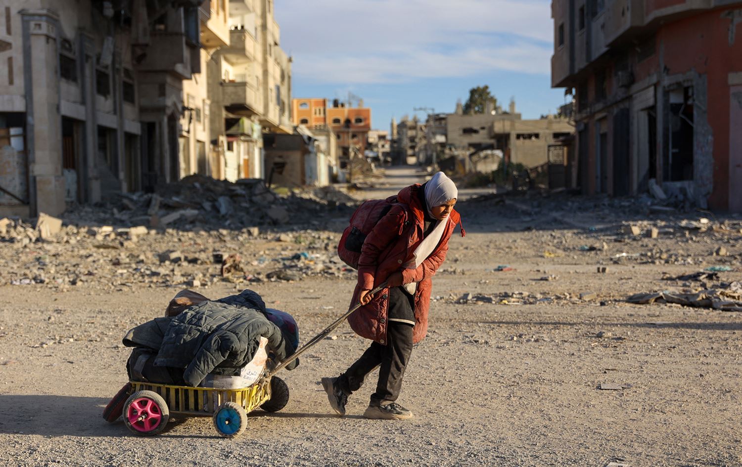 کیژێکی غەززە بەهۆی جەنگەوە ئاوارە بووە و کەلوپەلەکانی بەدوای خۆیدا رادەکێشێت. وێنە: AFP