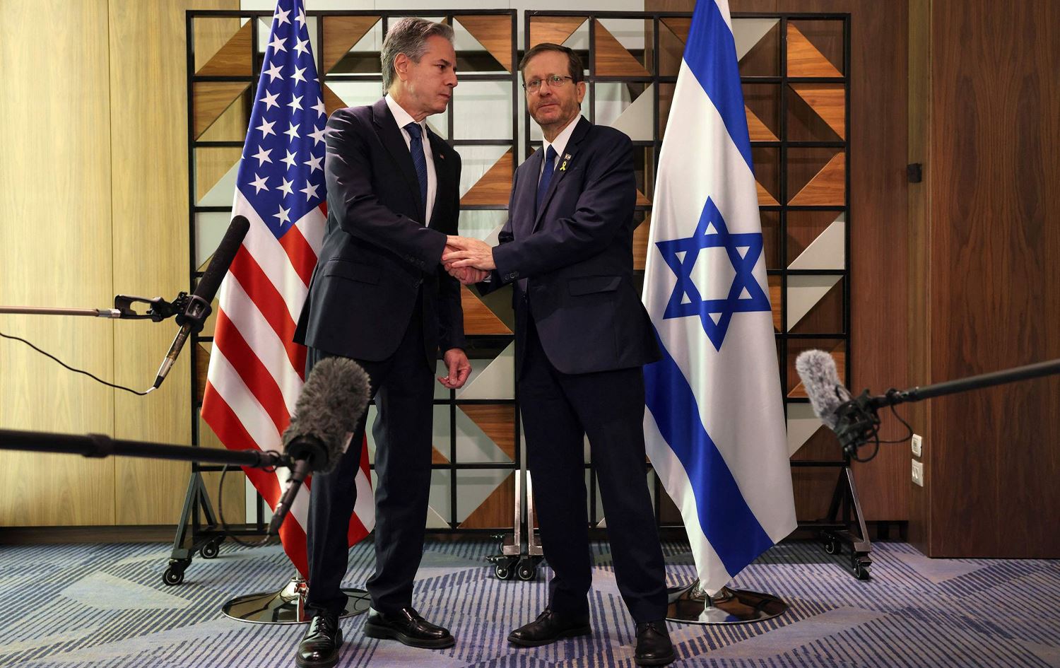 ئەنتۆنی بلینکن، وەزیری دەرەوەی ئەمریکا و ئیسحاق هێرزۆگ، سەرۆکی ئیسرائیل. وێنە: Kevin MOHATT / POOL / AFP
