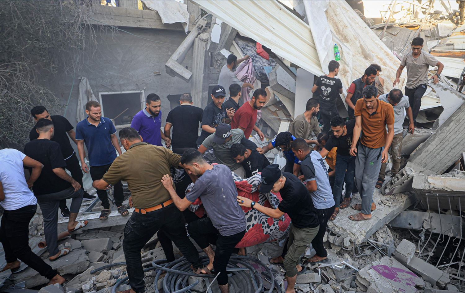 دەرهێنانی بریندارێک لەنێو دارووپەردووی باڵەخانەیەک لە خان یونسی غەززە کە بەهۆی بۆردوومانی ئیسرائیلەوە خاپوور بووە. وێنە: AFP