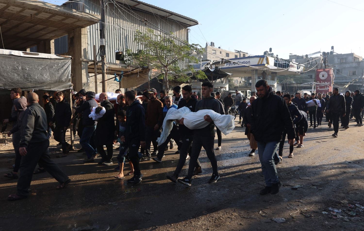 ژمارەیەک فەلەستینی تەرمی سێ کەسیان بەدەستەوە گرتووە کە شەوی 20-12-2024 بەهۆی بۆردوومانێکی ئیسرائیل لە غەززە کوژراون، وێنە: Omar AL-QATTAA / AFP