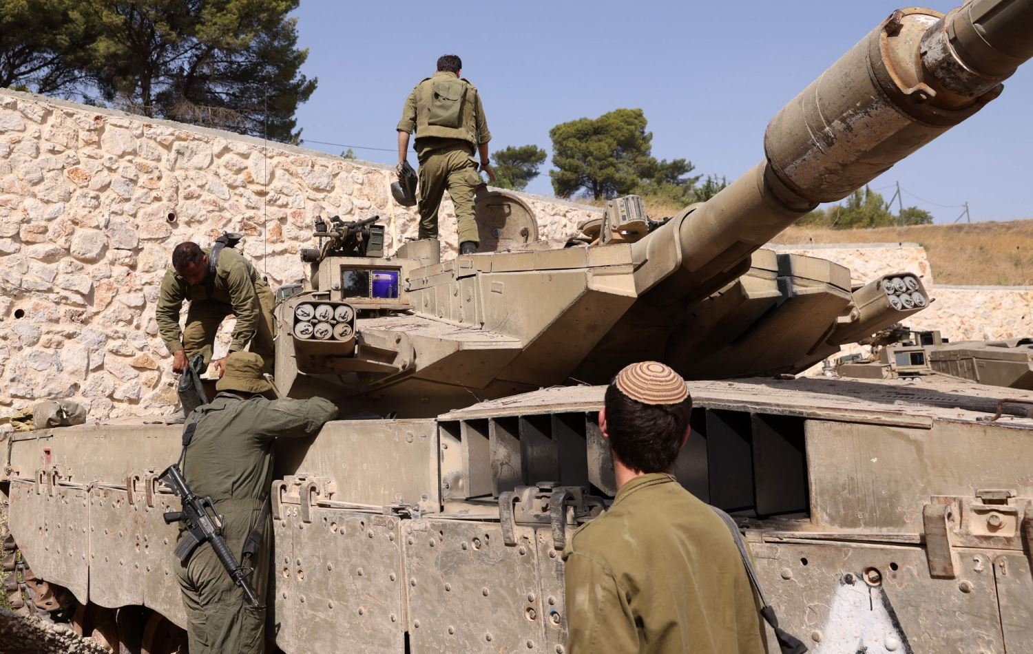ژمارەیەک سەربازی ئیسرائیلی لە نزیک تانکێکی مێرکاڤا لەنزیک سنووری لوبنان، وێنە: Jalaa MAREY / AFP