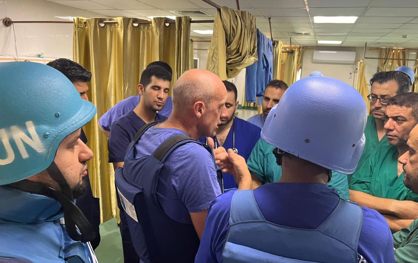 دیمەنی نێو نەخۆشخانەی شیفا، ستافی تەندروستی جیهانی لەگەڵ کارمەندان قسە دەکەن. وێنە: WHO