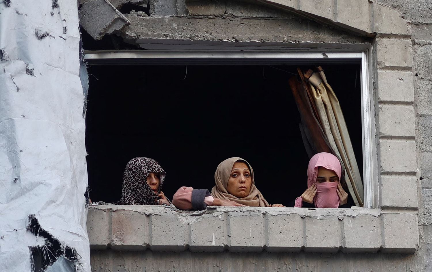 سێ ژنی فەلەستینی لە پەنجەرەوە سەیری شوێنی بۆردوومانکراوی رۆژی شەممە دەکەن. وێنە: Reuters