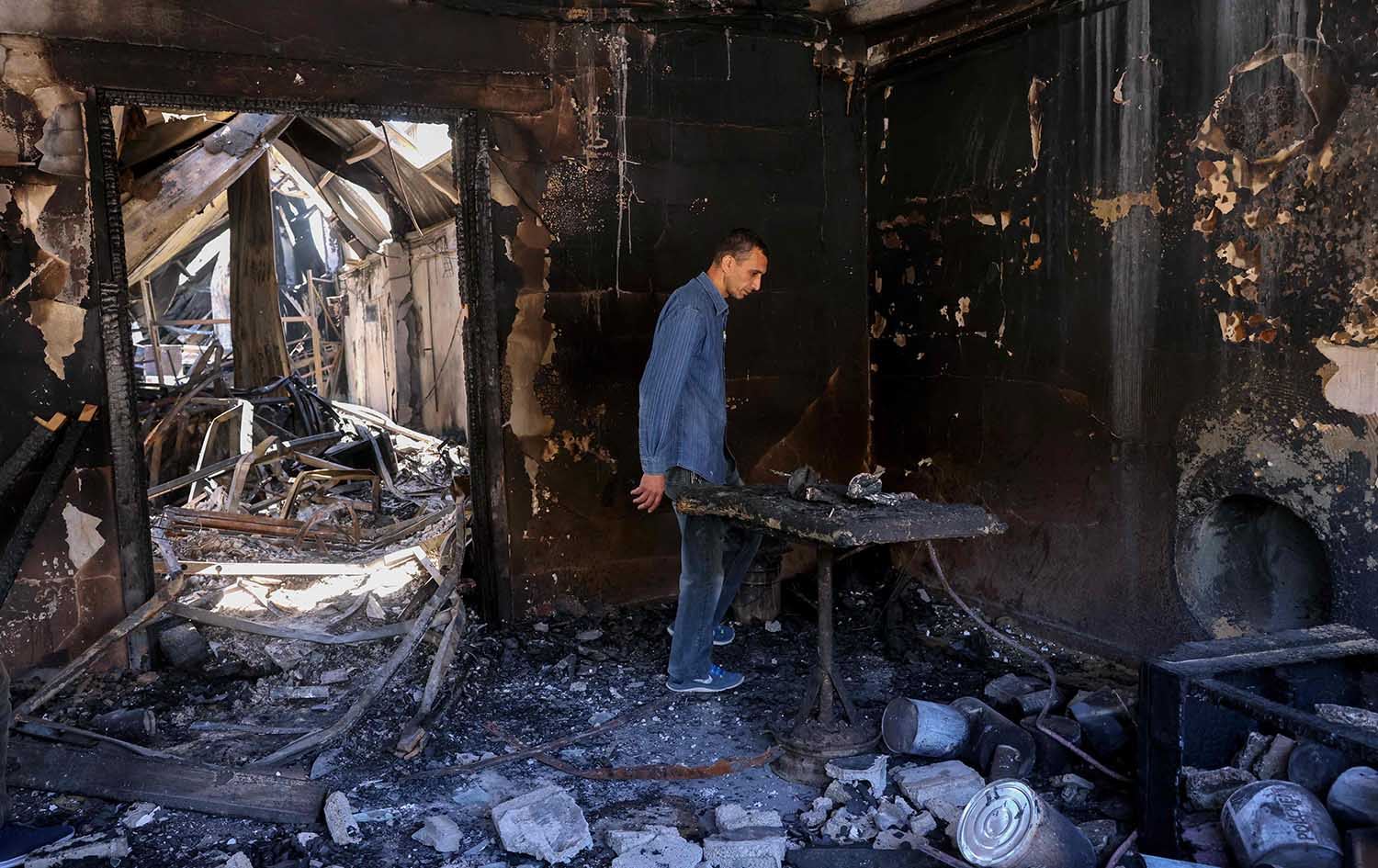 خاوەنی کارگەیەک لەنێو داروپەردووی کارگە رووخاوەکەی لە غەززە. وێنە: AFP / Emmanuel DUNAND
