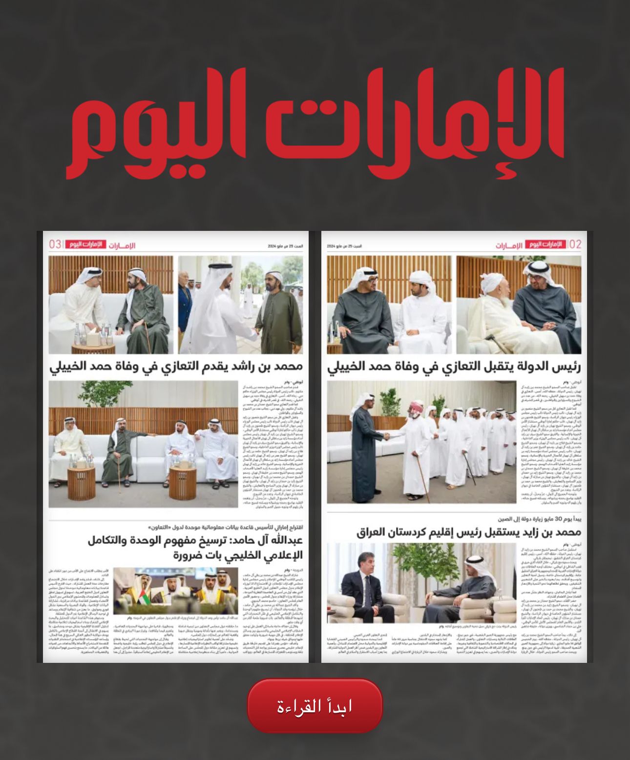 رۆژی هەینی، 24ی ئایار، نێچیرڤان بارزانی بە سەردانێکی فەرمی سەردانی ئیماراتی کرد و لەلایەن محەممەد بن زاید ئال نەهیان، سەرۆکی وڵاتەکەوە پێشوازی گەرمی لێکرا؛ دواتر لە کۆشکی کەنار دەریا (الشاطئ) بە دووقۆڵی کۆبوونەوە.