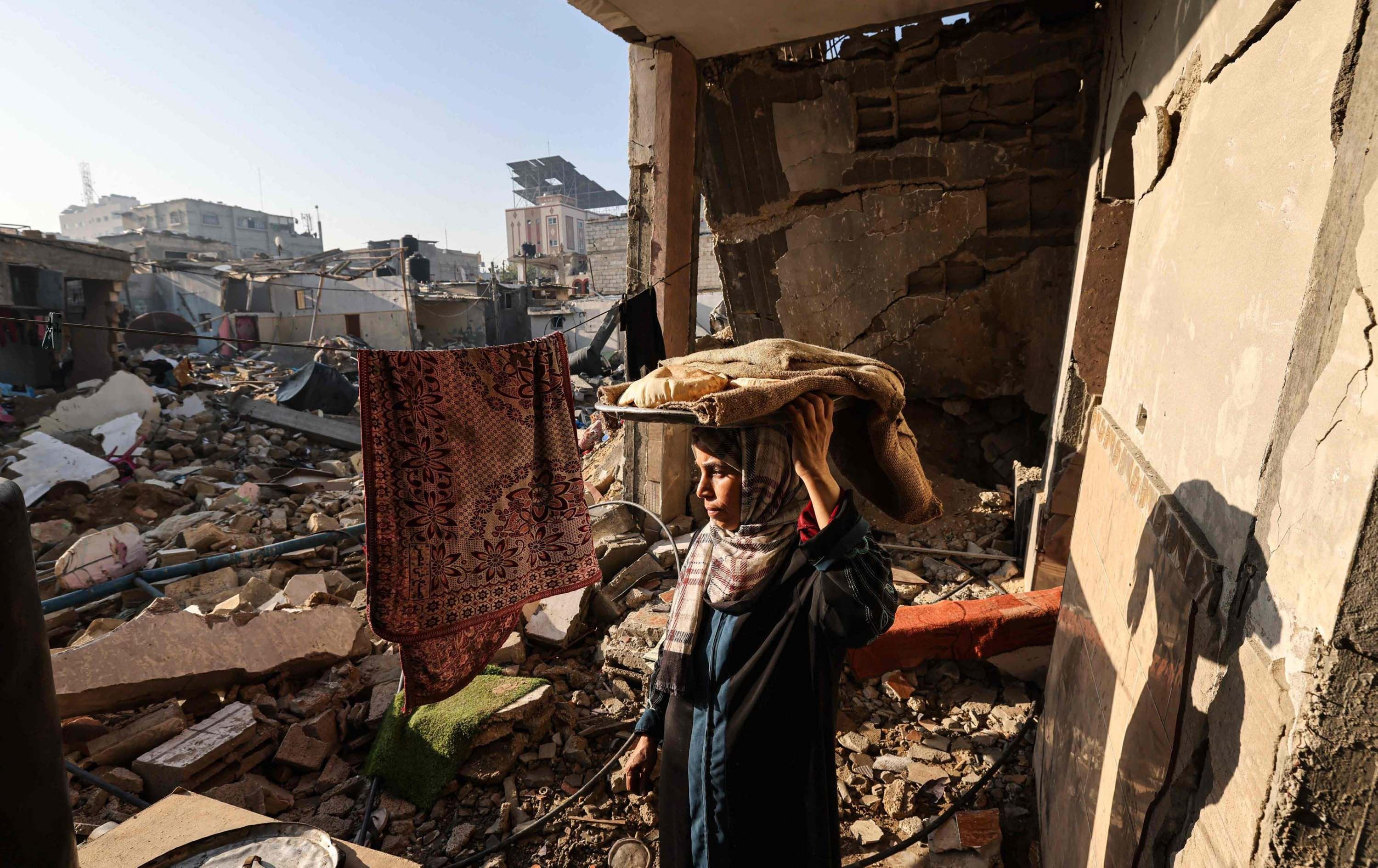 ژنێکی خەڵکی غەززە سینییەک نانی بە سەری هەڵگرتووە و لەنێو ماڵە رووخاوەکەیدایە. وێنە: AFP