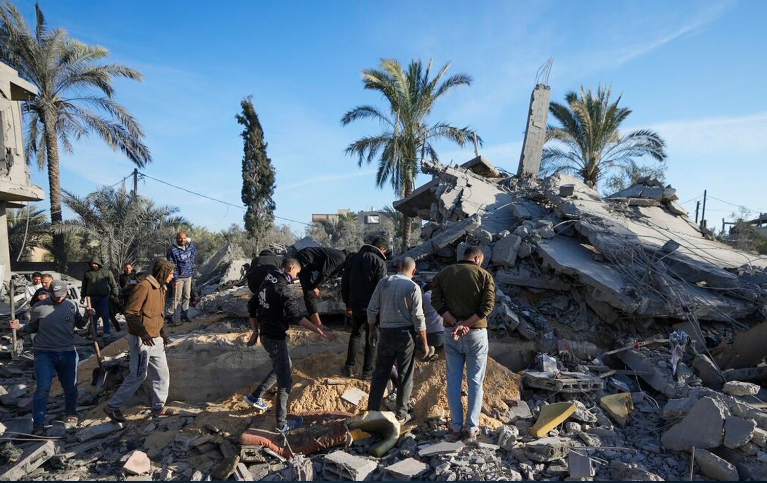 ژمارەیەک هاووڵاتی فەلەستینی لە دیار پاشماوەی خانووێکی رووخاو وەستاون کە بەهۆی هێرشی ئیسرائیلەوە وێران بووە. وێنە: Hana Abdelkarim- AP