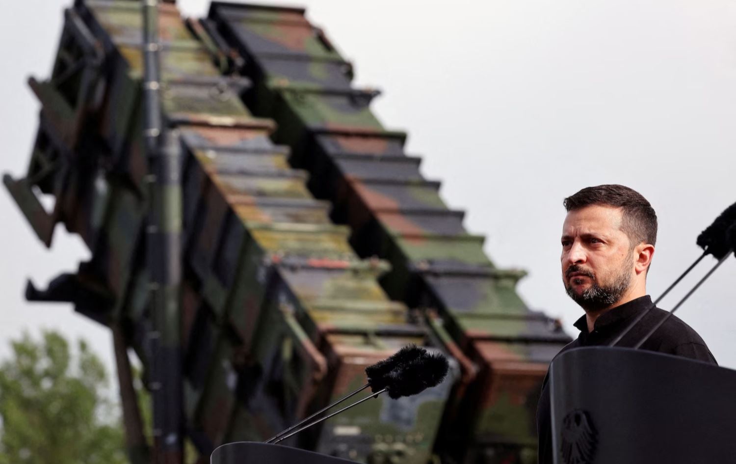 ڤۆلۆدیمیر زیلینسکی، سەرۆکی ئۆکراینا بنکەیەکی سەربازی لە ئەڵمانیا بەسەردەکاتەوە. وێنە: (Jens Buttner/Pool/Reuters)