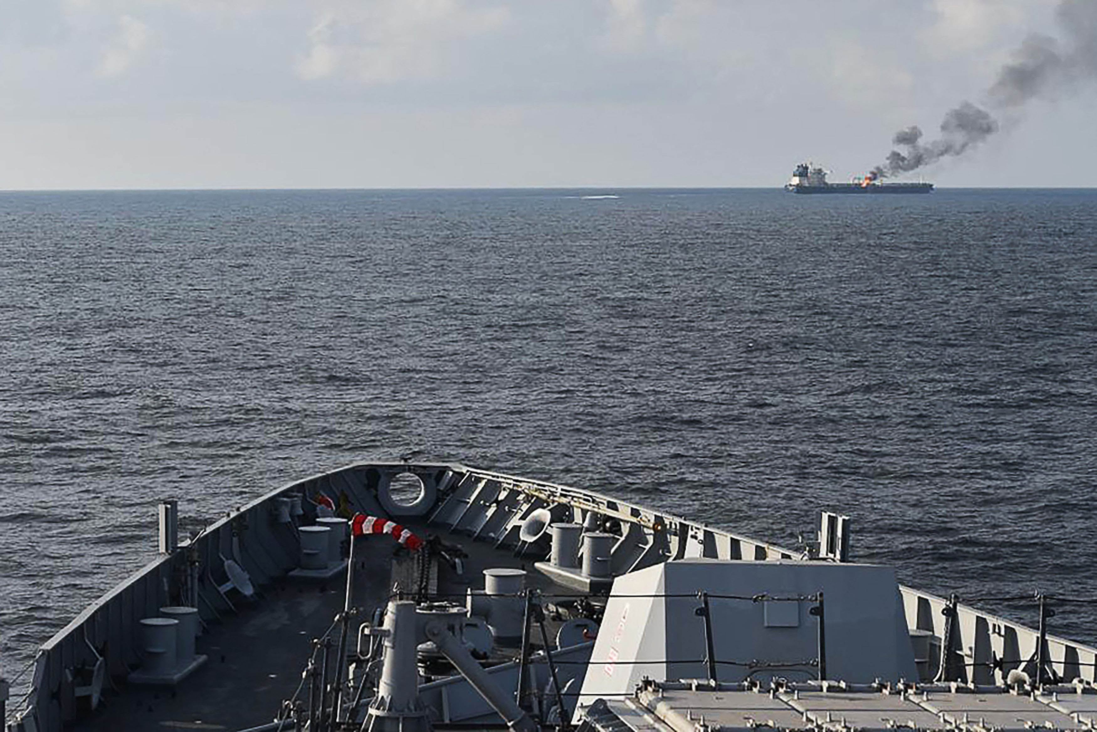 وێنەی ئەو کەشتییە نەوتهەڵگرەی بەریتانیا کە حووسییەکان هێرشیان کردبووە سەری. وێنەکە لەلایەن وەزارەتی بەرگریی هیندستانەوە بڵاوکراوەتەوە.