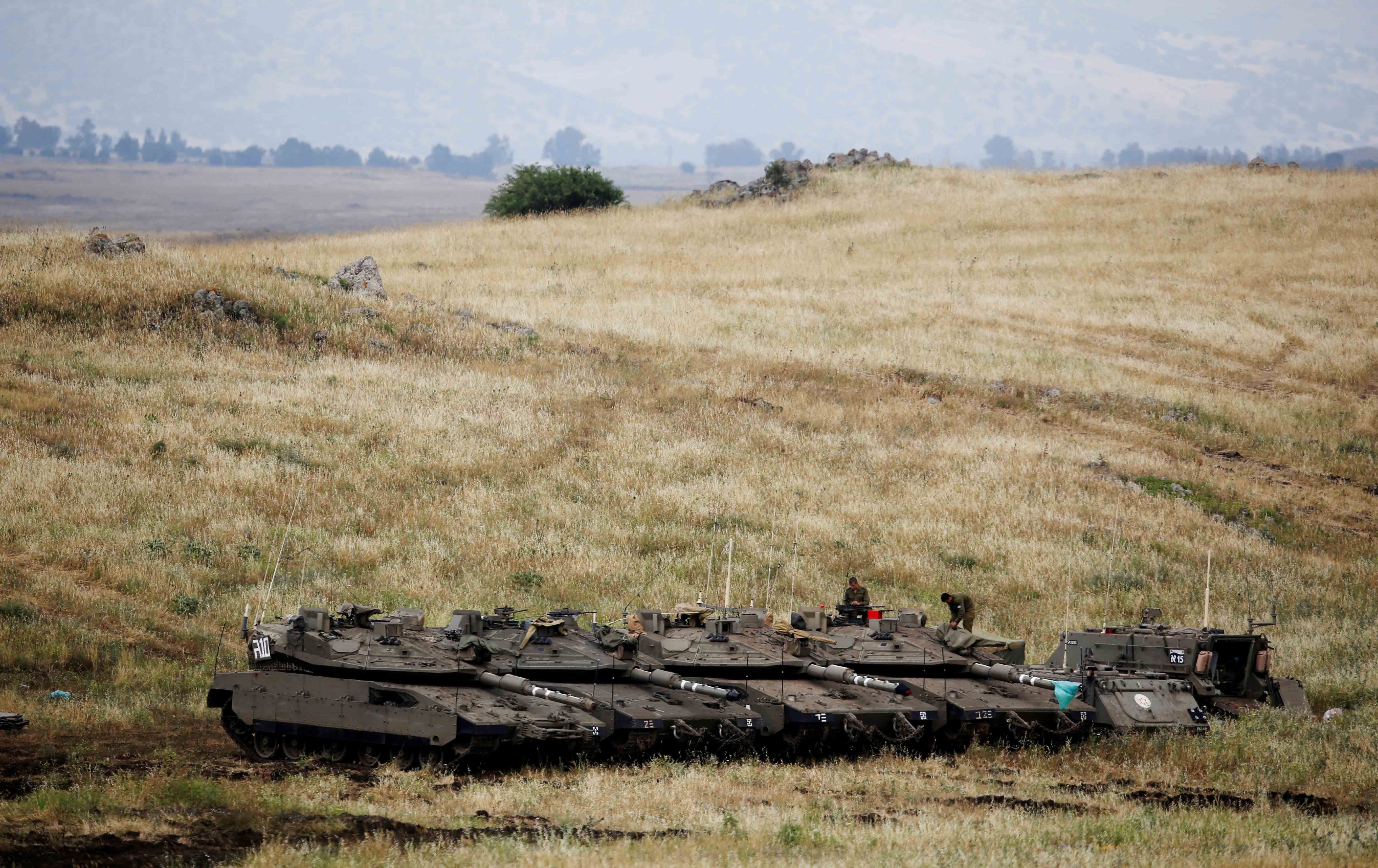سەربازە ئیسرائیلیەکان لەسەر تانکەکانیان دانیشتوون لە بەرزاییەکانی جۆلان. وێنە: Reuters