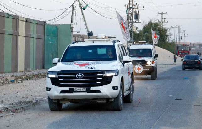 ئۆتۆمبێلەکانی خاچی سوور تەرمی دوو بارمتە دەگوازنەوە دوای ئەوەی لەلایەن چەکدارانی حەماسەوە رادەستکران، لە دێر ئەلبەلاح لە غەززە، رۆژی پێنجشەممە 30ی ئۆکتۆبەری 2025. وێنە: مەحموود عیسا/رۆیتەرز.