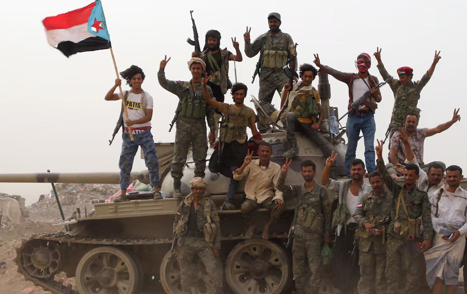 هێزەکانی باشووری یەمەن چوونەتە سەر تانکێک و ئاڵاکەیان بەرزدەکەنەوە. وێنە: Reuters