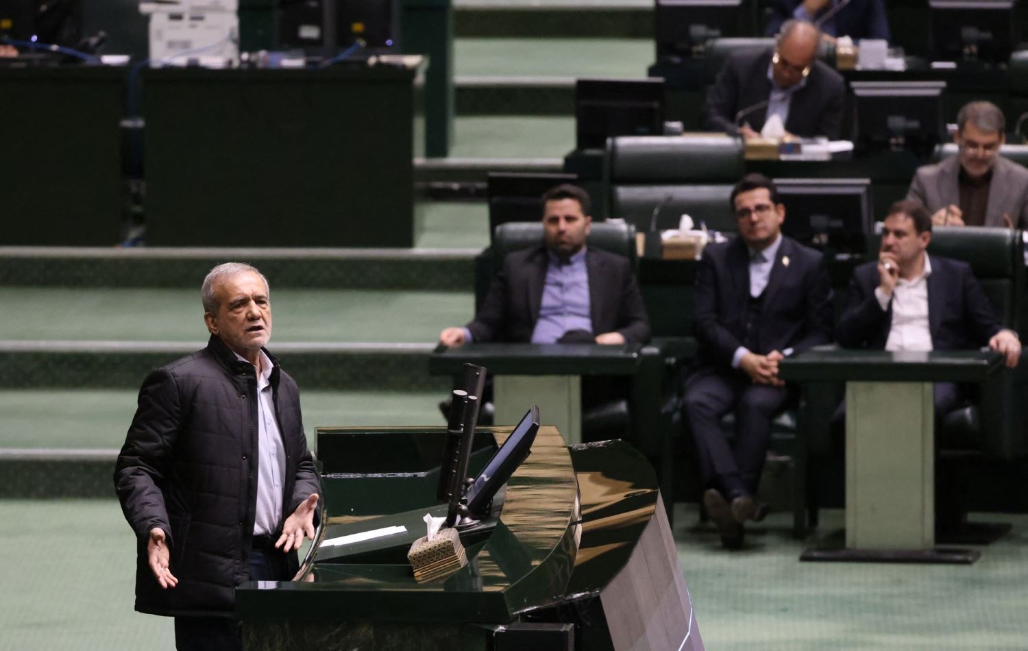 مەسعود پزیشکیان، سەرۆککۆماری ئێران ئەمڕۆ لەکاتی قسەکردن لە پەرلەمانی وڵاتەکەی، وێنە: ATTA KENARE / AFP
