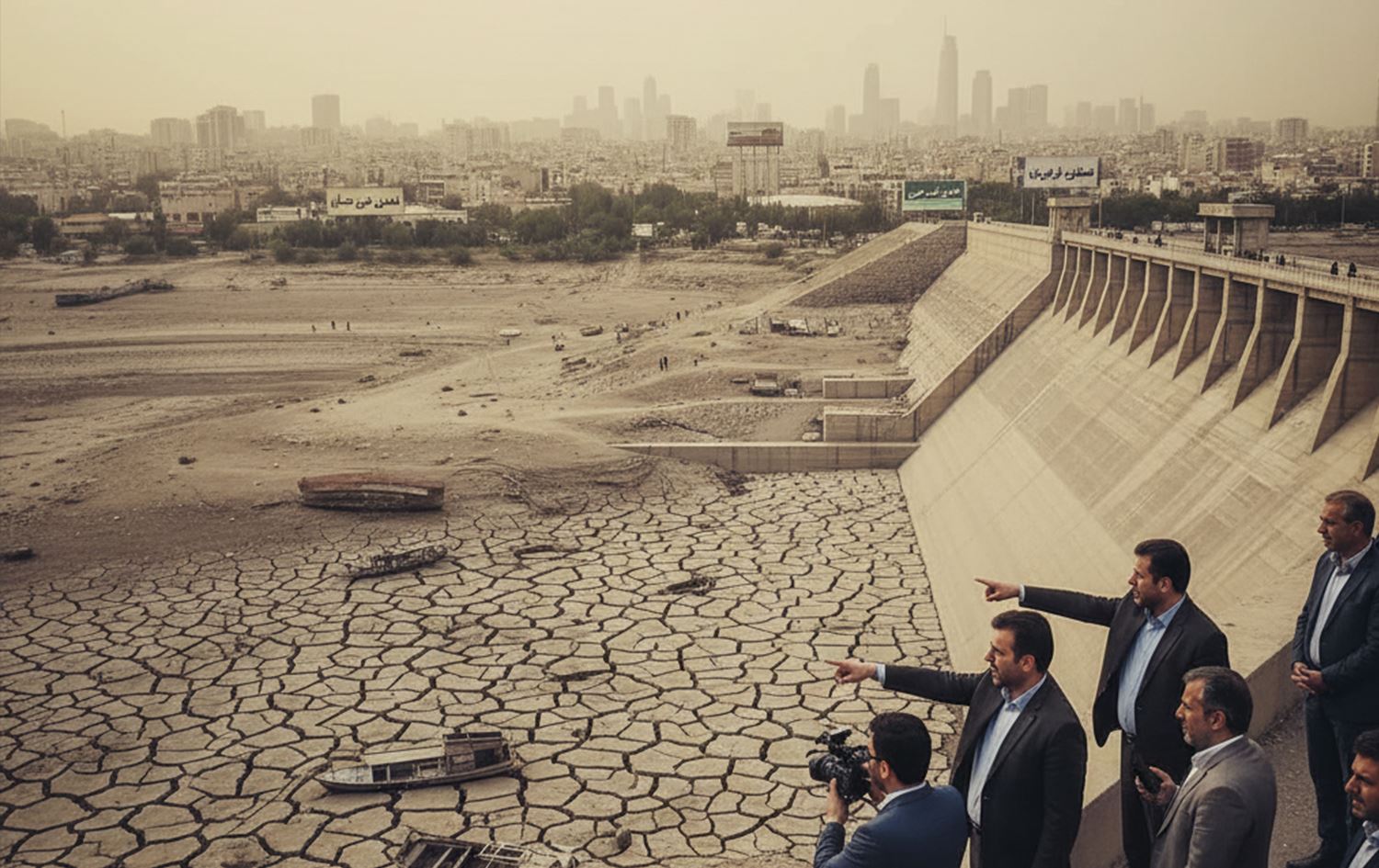 وێنەکە شاری تاران و بەنداوێکی وشکبوو پێشان دەدات، کە چەند کەسێک سەیری دەکەن: بە ژیریی دەستکرد دروستکراوە