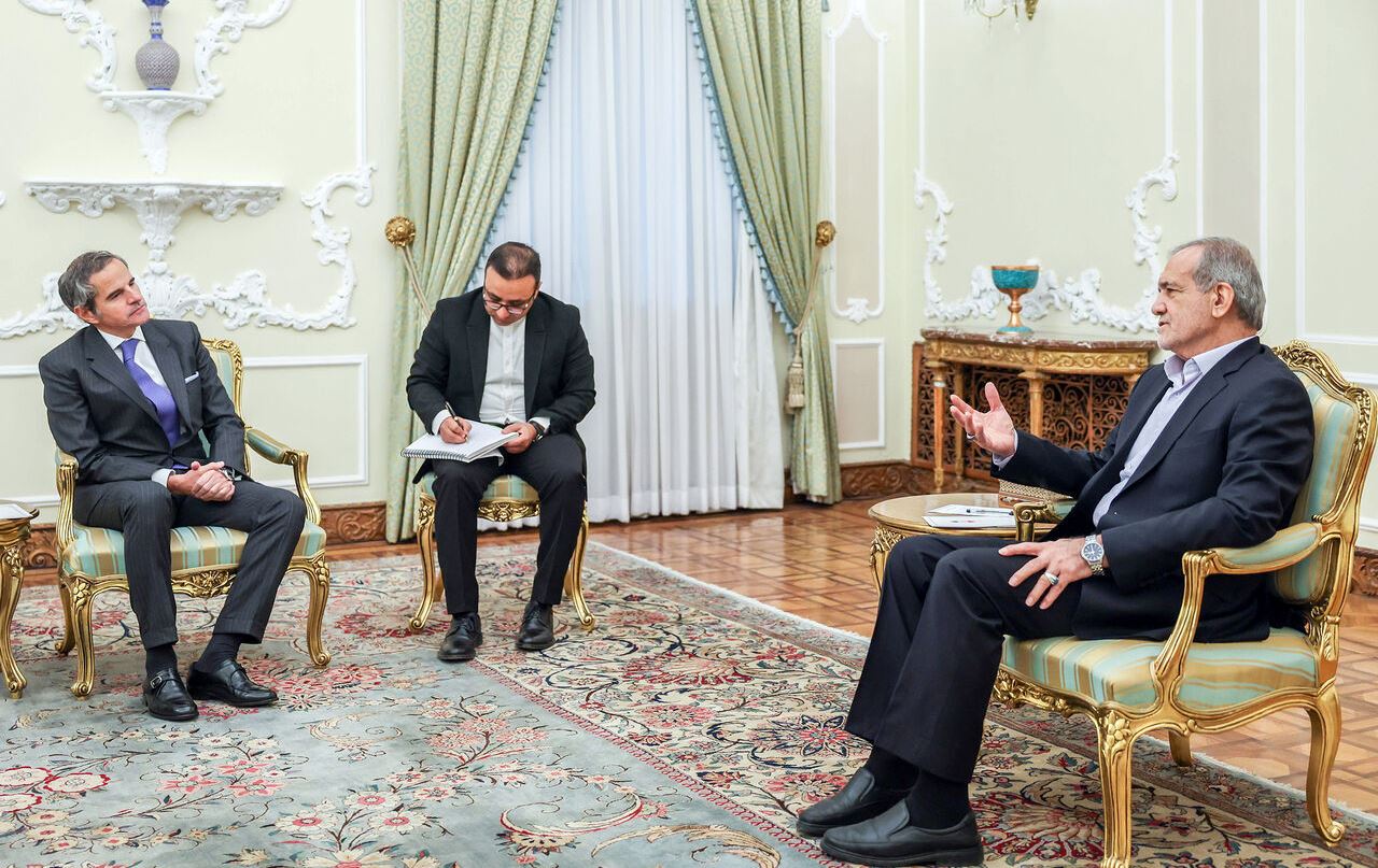 دیداری رافایێل گرۆسی، بەڕێوەبەری ئاژانسی نێودەوڵەتیی وزەی ئەتۆم و مەسعود پزشکیان، سەرۆککۆماری ئێران. وێنە: IRNA