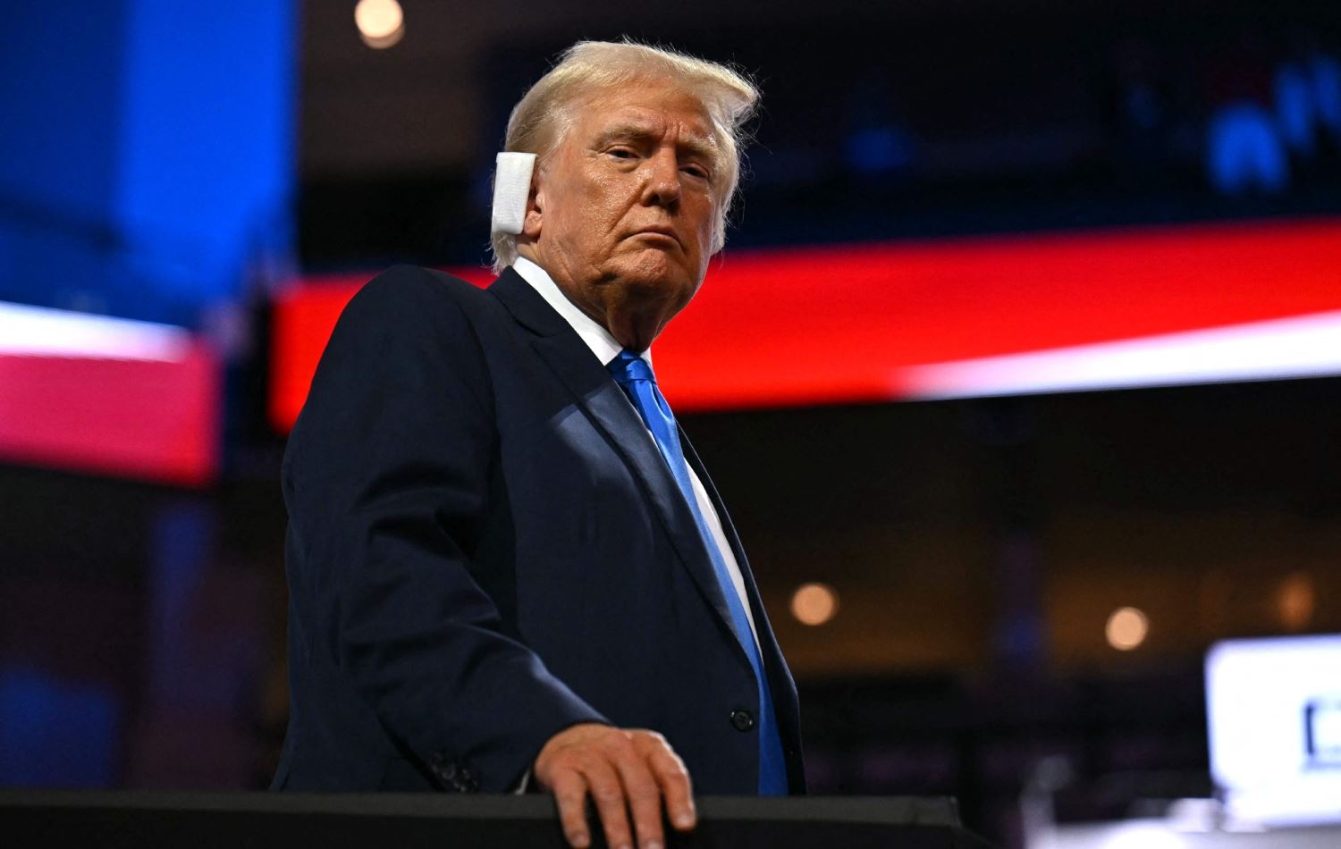 دۆناڵد ترەمپ لە کۆنگرەی کۆمارییەکان لە میڵوۆکی بە گوێی بەستراوەوە دوای بریندارکردنی، قسە بۆ لایەنگرانی دەکات، وێنە: ANGELA WEISS / AFP