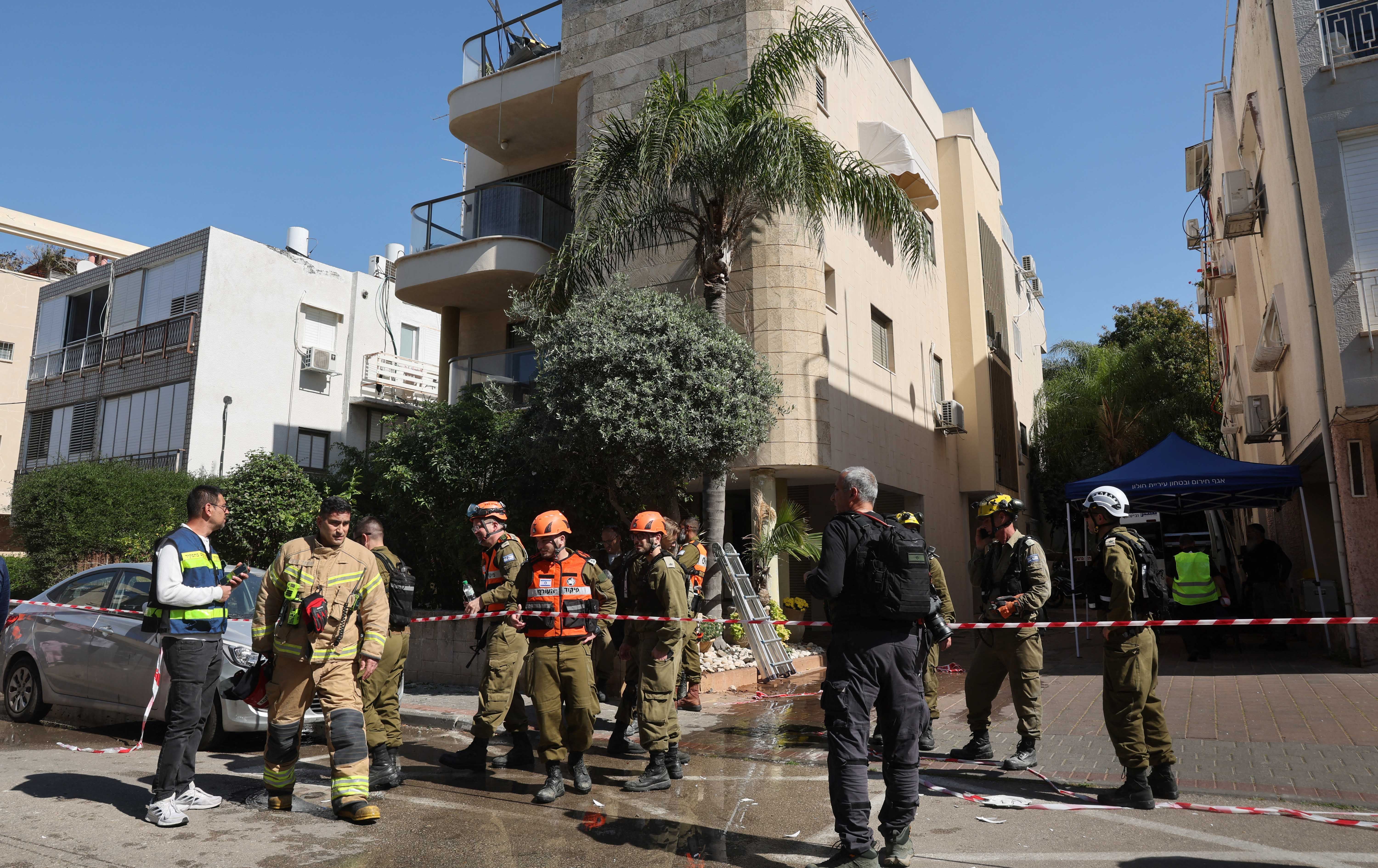 تیمەکانی فریاگوزاری و ئاگرکوژێنەوەی ئیسرائیل ئەو شوێنەیان گەمارۆ داوە کە بەهۆی هێرشێکەوە لە شاری خۆلۆن لە دەوروبەری تەل ئەڤیڤ زیانی پێگەیشتووە، لە 17ی ئازاری 2026. وێنە: AFP