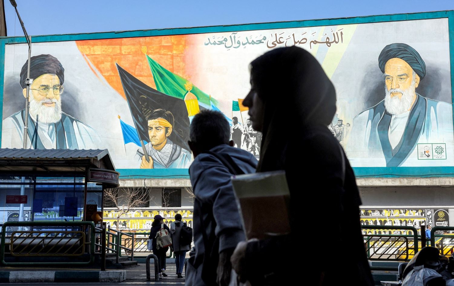 ئافرەتێک بە لای پۆستەرێکی عەلی خامنەیی، رێبەری ئێستای کۆماری ئیسلامیی ئێران و خومەینی، رێبەری پێشوو دا دەڕوات. وێنە: AFP