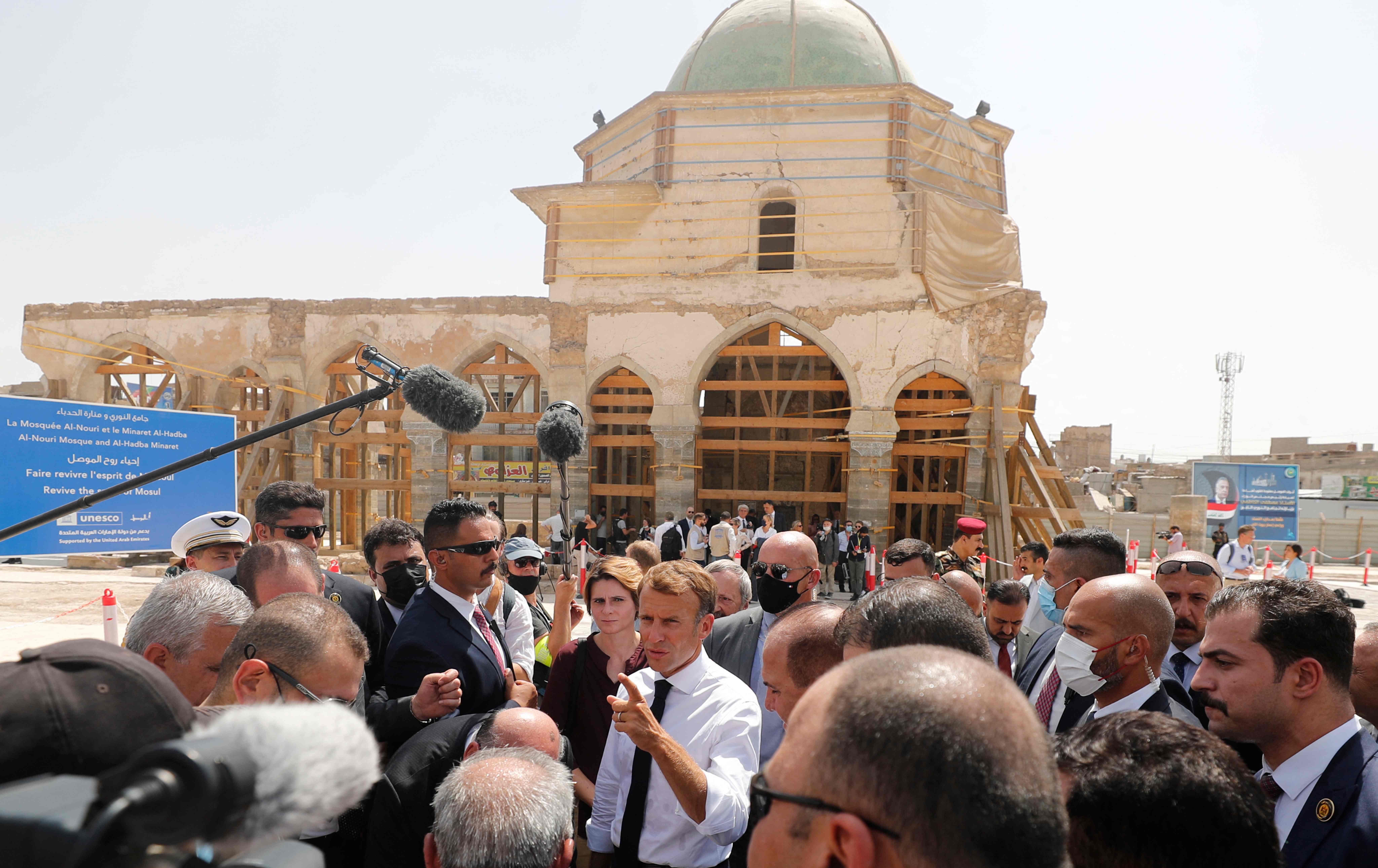 سەردانی ئیمانوێل ماکرۆن سەرۆکی فەرەنسا بۆ شاری نووری لە موسڵ. 29-08-2021. وێنە: Ahmad AL-RUBAYE / AFP