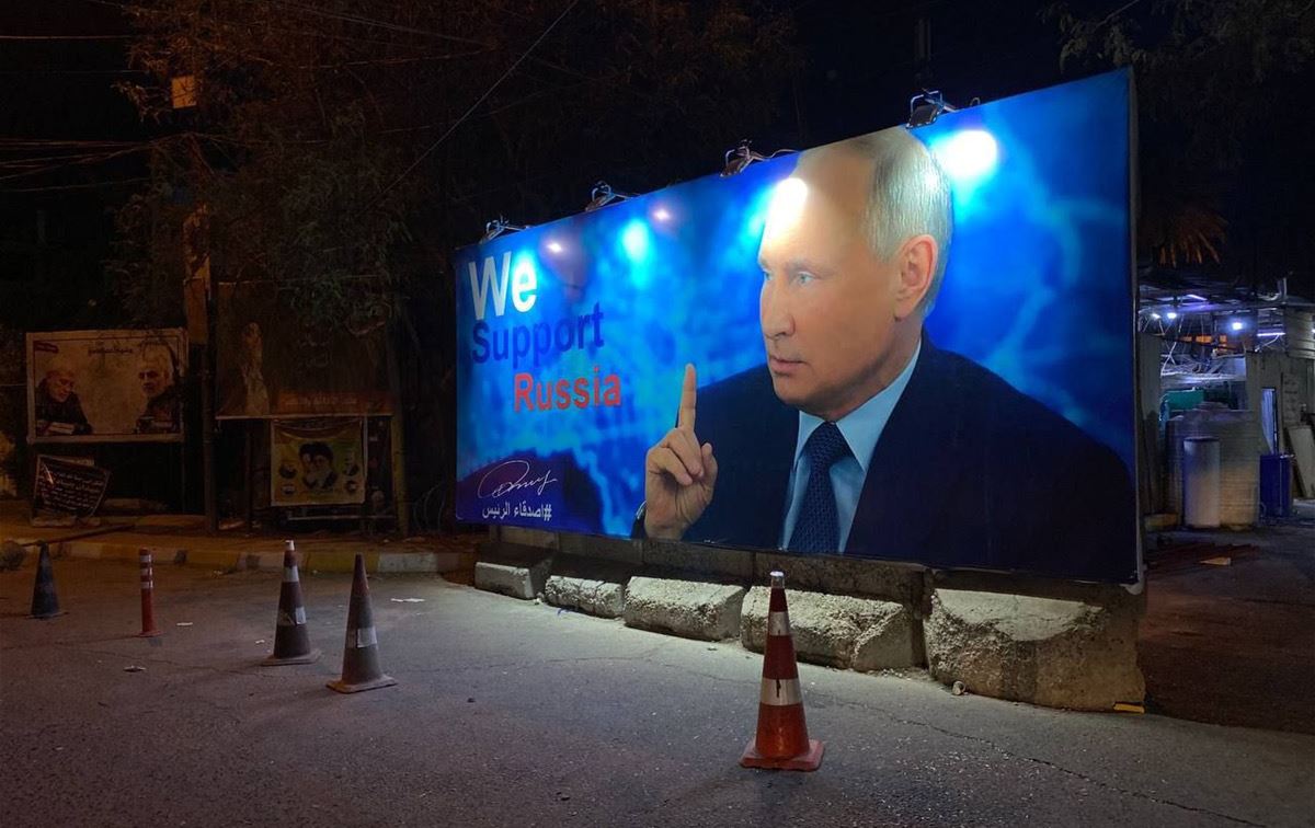لە شەقامێکى گشتى گەڕەکى جادریەى بەغداى پایتەختی عێراق، وێنەیەکى ڤلادیمیر پووتن، سەرۆکى رووسیا دادەنرێت، کە لەسەرى نووسراوە: "پاڵپشتی رووسیا دەکەین".