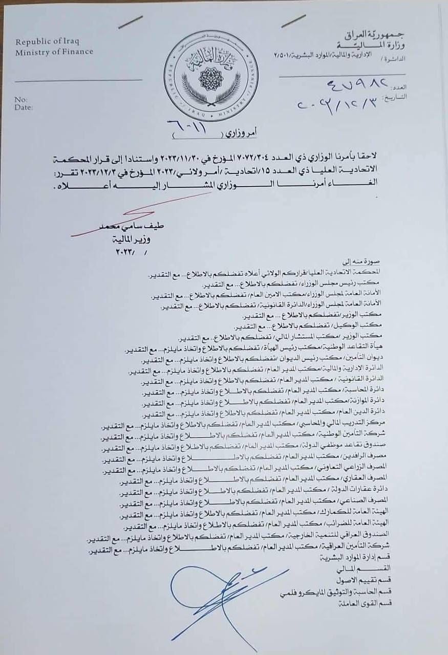 ئەمڕۆ یەکشەممە، 03-12-2023، تەیف سامی، وەزیری دارایی عێراق پاڵپشت بە بڕیاری ئەمڕۆی دادگەی باڵای فیدراڵی، فەرمانە وەزارییەکەی پێشووی خۆی هەڵوەشاندەوە کە سەبارەت بە کۆتاییهاتنی دەسەڵاتەکانی مەسعود حەیدەر رۆستەم، بریکاری وەزارەتی دارایی بە وەکالەت لە 30-11-2023 دەری کردبوو.