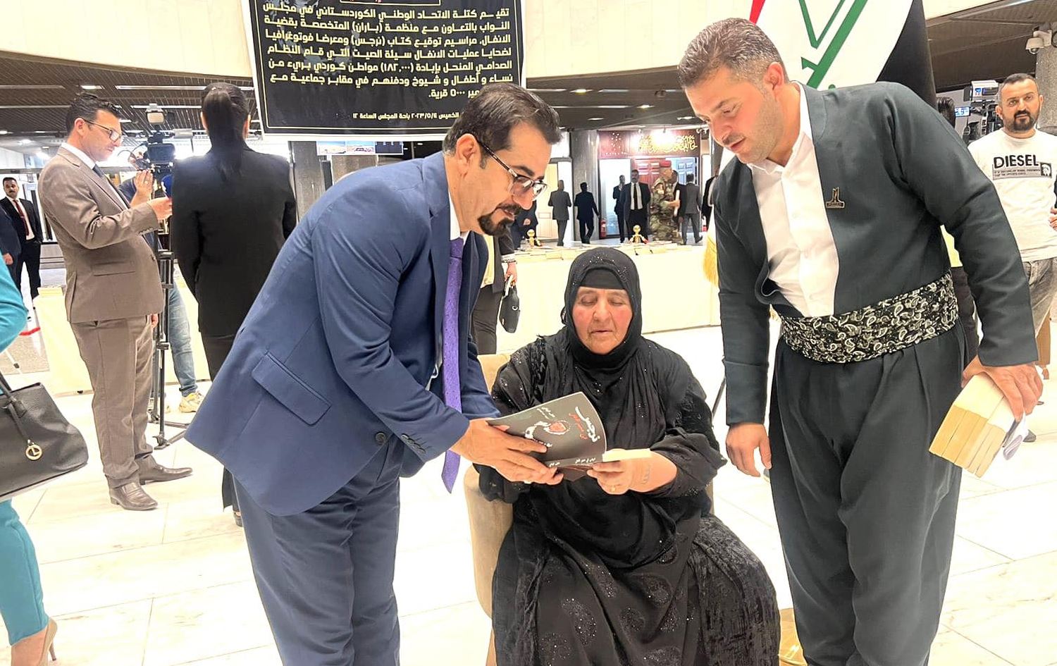 ئارام محەممەد گوتی، وەک رێکخراوەکەیان داوایان لە فراکسیۆنی یەکێتیی نیشتمانیی کوردستان لە پەرلەمانی عێراق کرد هاوکارییان بکەن پێشەنگایەکی تایبەت بە ئەنفال لە پەرلەمانی عێراق بکەنەوە و لەو پێشەنگایەدا کتێبەکەیان دابەشکردووە؛ گوتیشی: "لە پێشەنگەکەدا کە شاخەوان عەبدوڵڵا، جێگری سەرۆکی پەرلەمانی عێراق ئامادەبوو نزیکەی 400 کتێبمان دابەشی سەر پەرلەمانتاران و سەرۆکی فراکسیۆنەکان کرد؛ بەشێوەیەک پێشوازی لێکرا لە چاوەڕوانی ئێمەدا نەبوو".