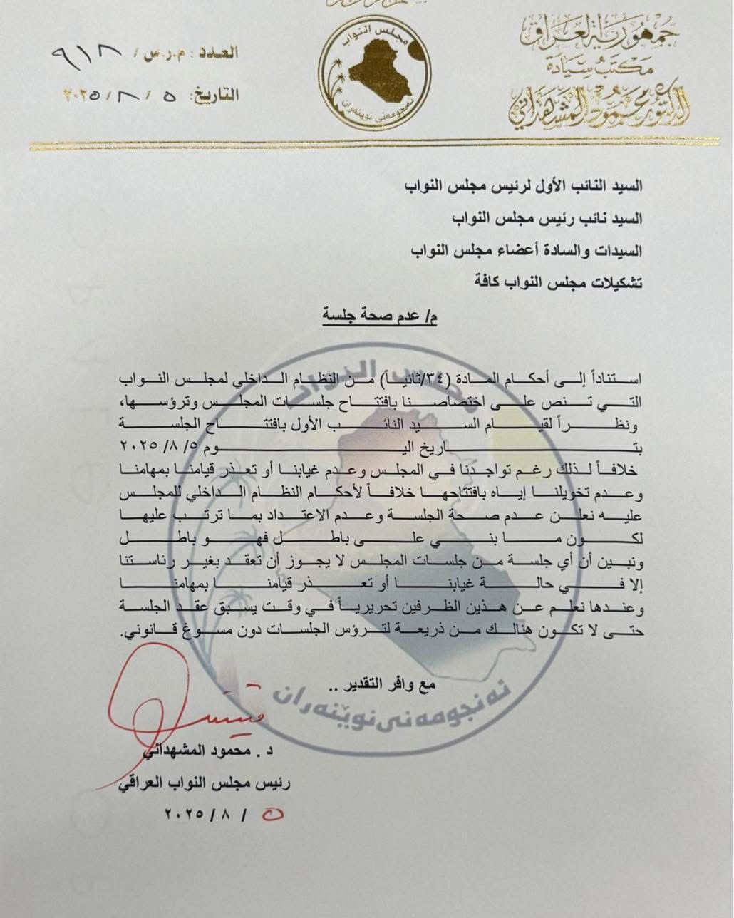 فەرمانگەی راگەیاندنی پەرلەمانی عێراق دەڵێت، بەهۆی ئامادەنەبوونی رێژەی یاسایی پەرلەمانتارەکان، دانیشتنەکە هەڵوەشاوەتەوە.