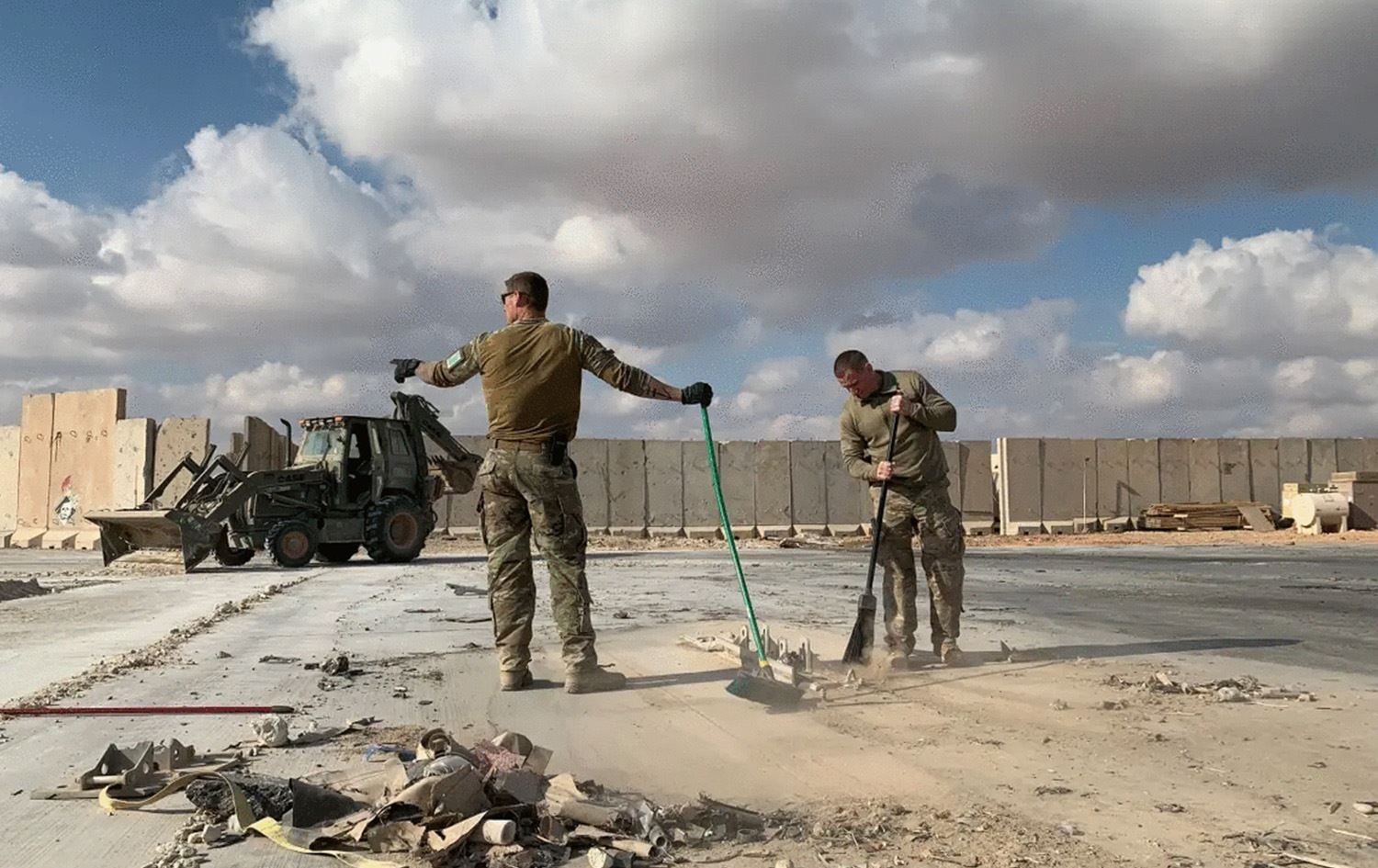 دوو سەربازی ئەمریکی لە 13-1-2020 لە سەربازگەی عەین ئەسەد لەدوای هێرشێک، خۆڵ و خاشاک پاکدەکەنەوە، وێنە: AFP