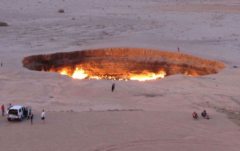 وێنەیەکی ئەرشیڤی "دەرگەی دۆزەخ" لە بیابانەکانی تورکمانستان کە گازی سرووشتی لێوە دێتەدەرەوە و دەسووتێت. IGOR SASIN/AFP via Getty Images