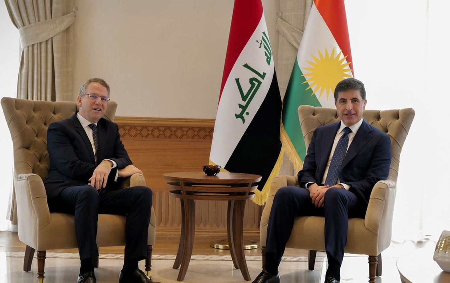 کۆبوونەوەی نێچيرڤان بارزانى، سهرۆكى ههرێمى كوردستان و پاتريك دورێل، باڵيۆزى فهرهنسا له عێراق، لە بەغدا