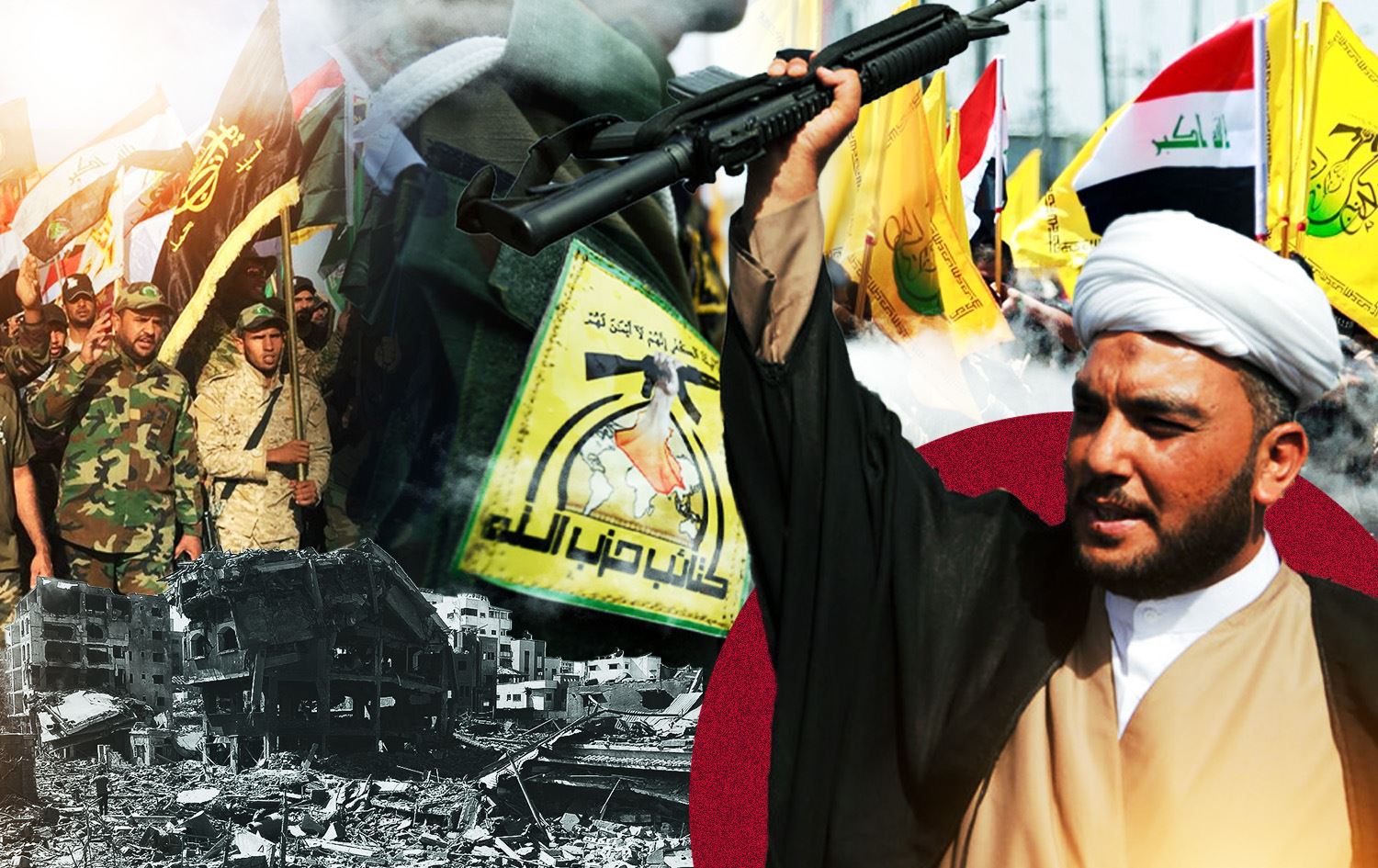 گرافیکێکی رووداو کە چەند دیمەنێکی گرووپە چەکدارەکانی عێراق، لۆگۆکانیان و غەززە تێیدا تێکەڵکراوە
