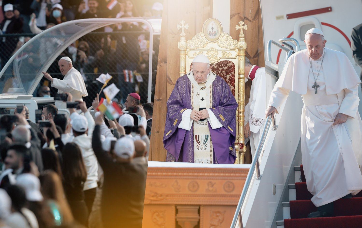 کاژێر 09:35ی رۆژی هەینی، 5-3-2021، پاپا فرانسیس 266ـەمین پاپای ڤاتیکان، لە فڕۆکەخانەی فیومیچینۆ لە رۆمای پایتەختی ئیتاڵیاوە بەرەو بەغدا بەڕێکەوت و کاژێر 02:00ـی دواینیوەڕۆ گەیشتە فڕۆکەخانەی نێودەوڵەتیی بەغدا و لەلایەن مستەفا کازمی، سەرۆکوەزیرانی عێراق پێشوازی لێکرا. دواتر لە هۆڵی ڤی ئای پی فڕۆکەخانەی نێودەوڵەتیی بەغدا، پاپا فرانسیس و سەرۆکوەزیرانی عێراق کۆبوونەوە.
