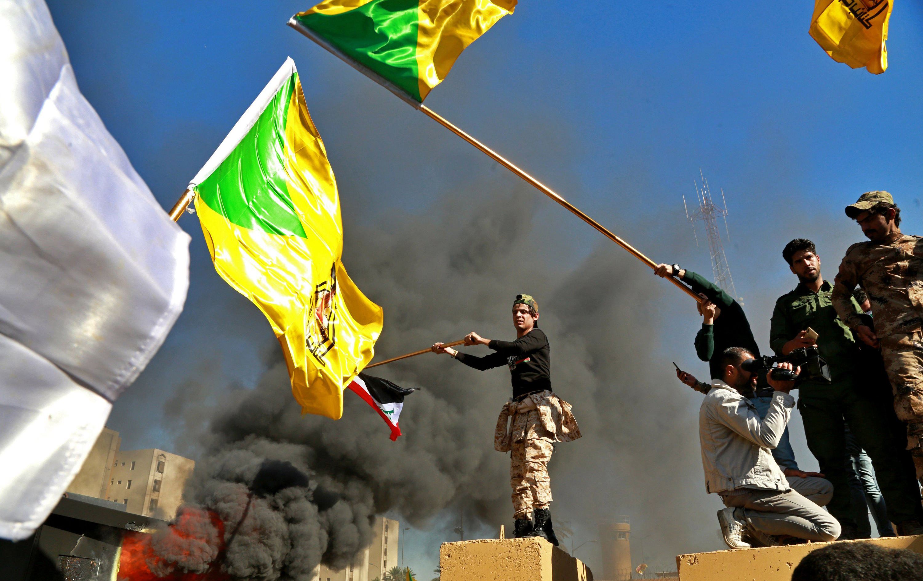 خۆپێشاندەرانی نزیک لە گرووپە چەکدارەکانی عێراق لەبەردەم باڵیۆزخانەی ئەمریکا، ئاڵای عێراق و حیزبوڵڵای عێراقییان بەرزکردووەتەوە، لە ساڵی 2019. وێنە: AP